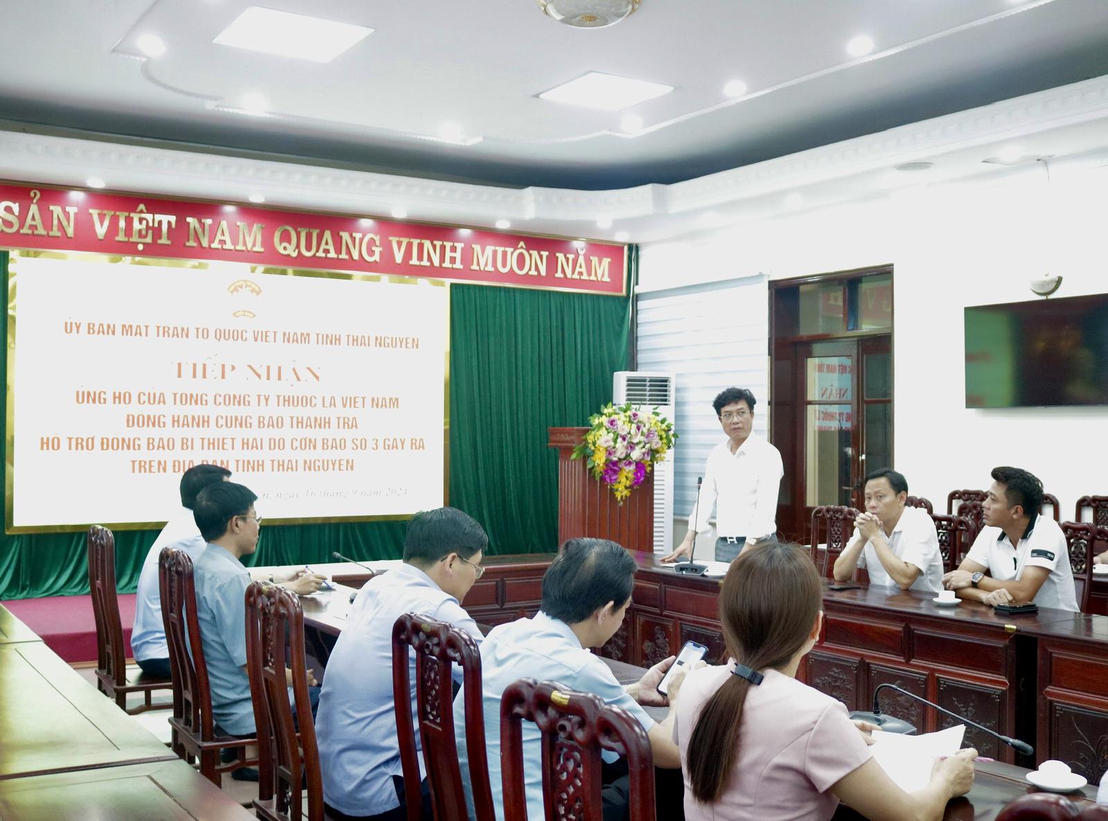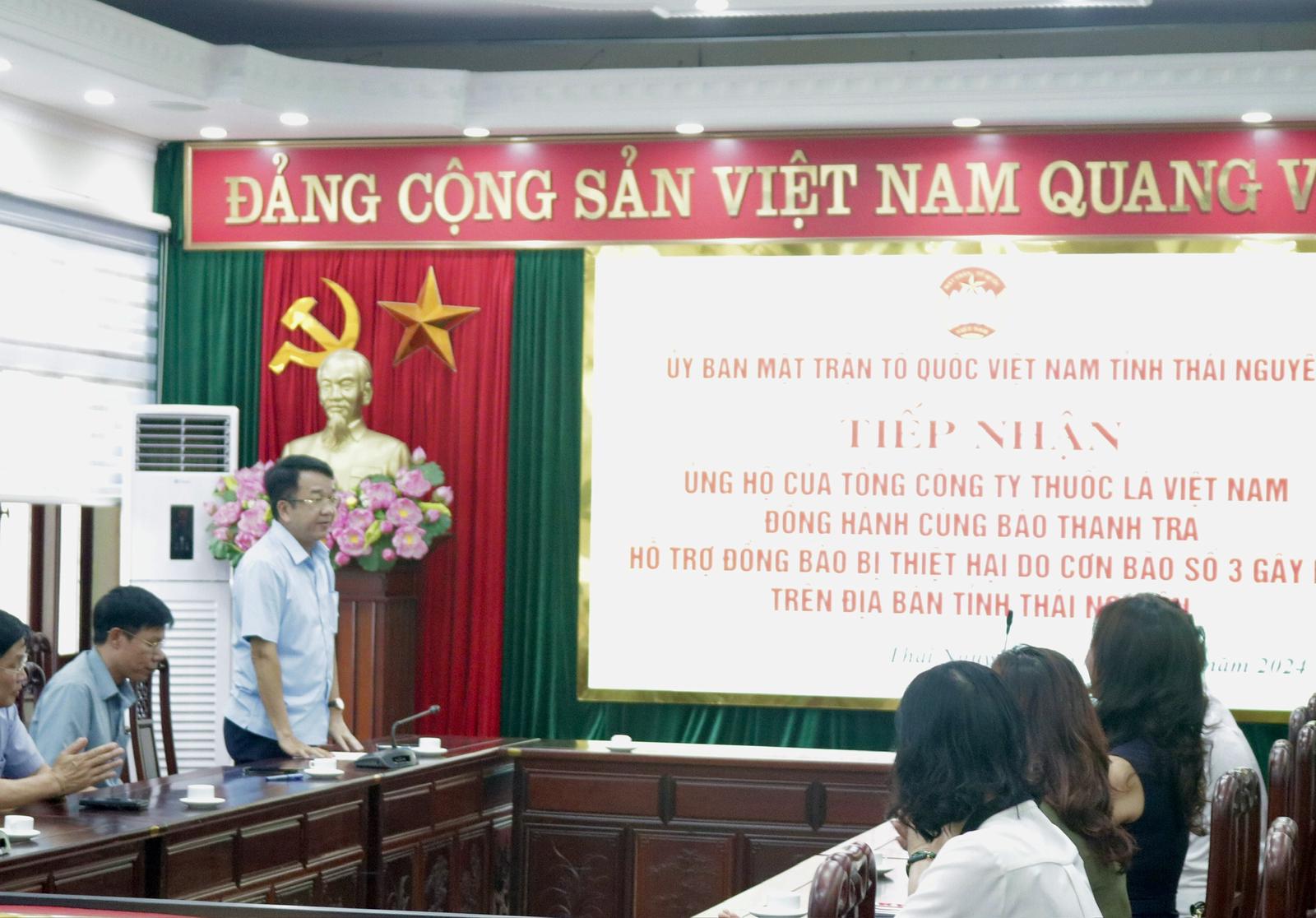 Ông Nguyễn Thanh Bình, Phó Chủ tịch UBND tỉnh Thái Nguyên gửi lời cảm ơn đến Ban Biên tập Báo Thanh Tra, Tổng Công ty Thuốc lá Việt Nam đã có những hành động thiết thực hỗ trợ kịp thời cho nhân dân Thái Nguyên sớm khắc phục những hậu quả do cơn bão số 3 và hoàn lưu bão gây ra mưa lớn và ngập úng trên địa bàn tỉnh.