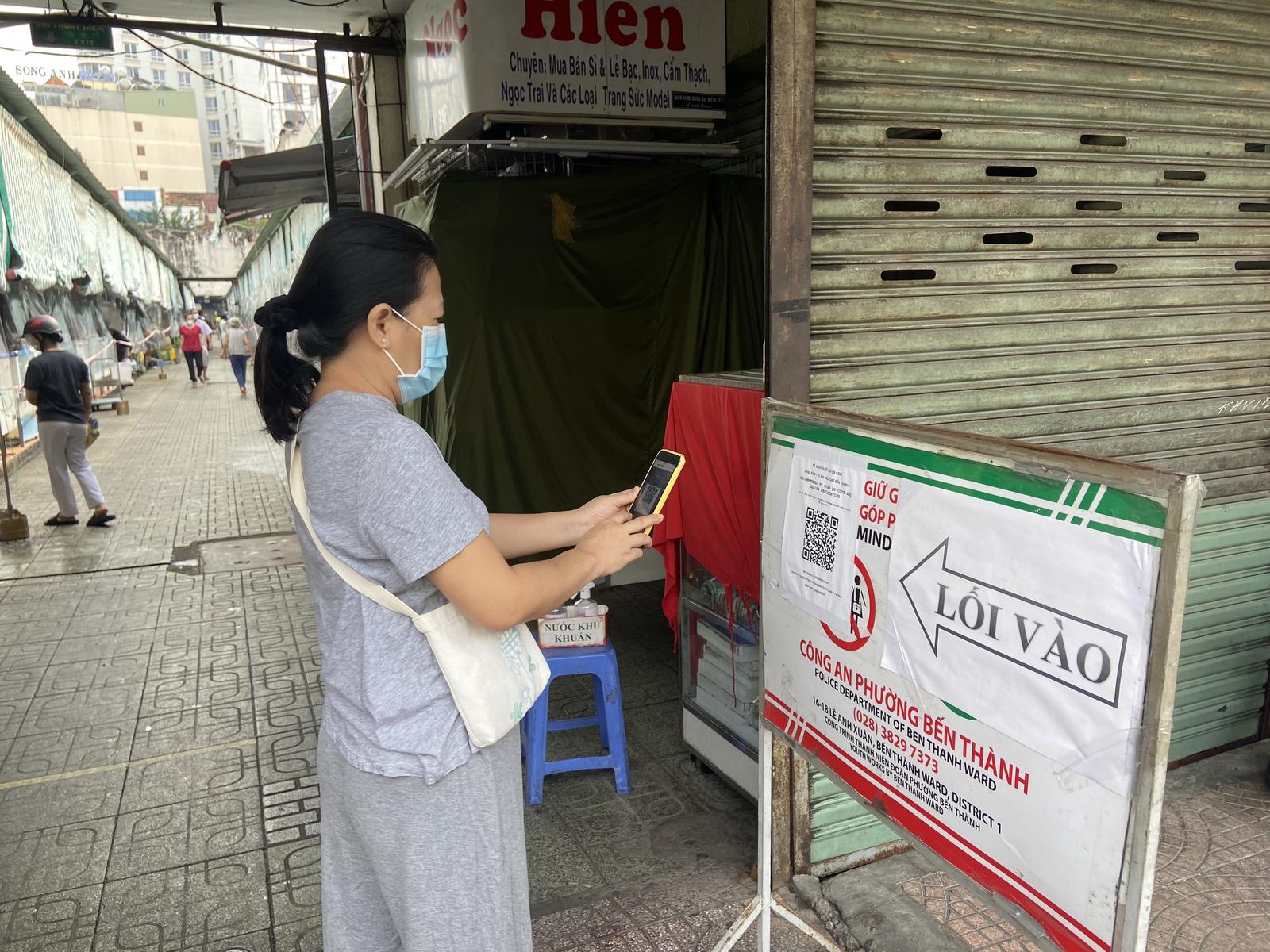 Người dân và tiểu thương ra vào chợ đều phải khai báo y tế. Ảnh: Chu Tuấn