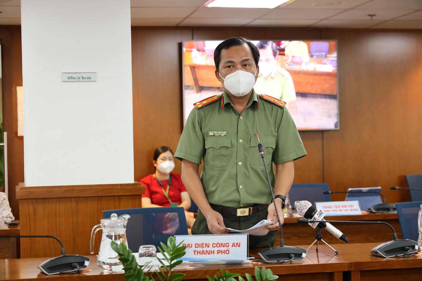 Phó Trưởng phòng Tham mưu Công an TP - Thượng tá Trần Thanh Giang thông tin tại họp báo. Ảnh: TTBC