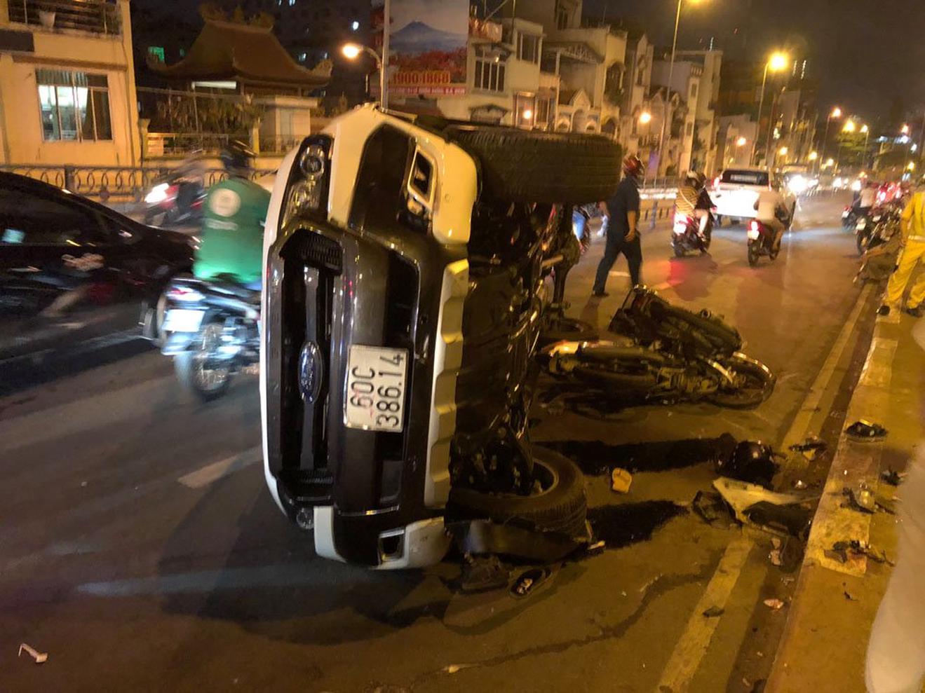 Tại hiện trường, xe bán tải lật nghiêng, hư hỏng nặng phận đầu, dầu nhớt chảy tràn. Hai chiếc xe máy bể nát nhiều bộ phận văng khắp mặt đường.