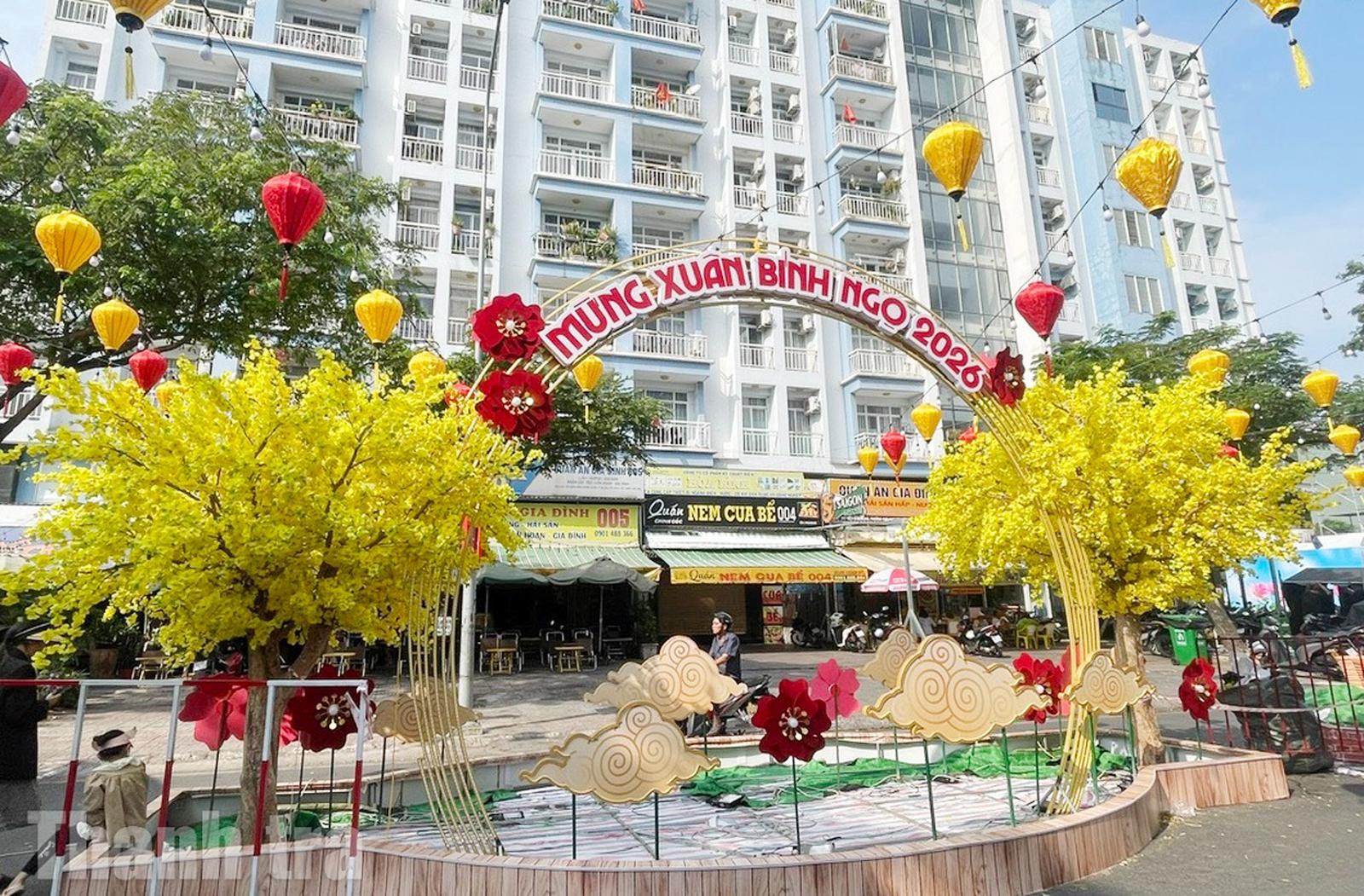 Rời phường Phú Định, hành trình Xuân tiếp tục đưa chúng tôi đến chợ hoa Tết Bình Đông, một không gian Tết rộn ràng không kém, nhưng mang sắc thái đô thị rõ nét hơn. Với quy mô hơn 500 điểm kinh doanh, chợ hoa Tết Bình Đông trải dài trên các tuyến đường của phường, tạo nên một “phố Xuân” ngập tràn màu sắc và sinh khí. Ngay từ cổng chào, hệ thống trang trí rực rỡ cùng ánh đèn nghệ thuật đã báo hiệu một mùa Xuân đang đến rất gần.