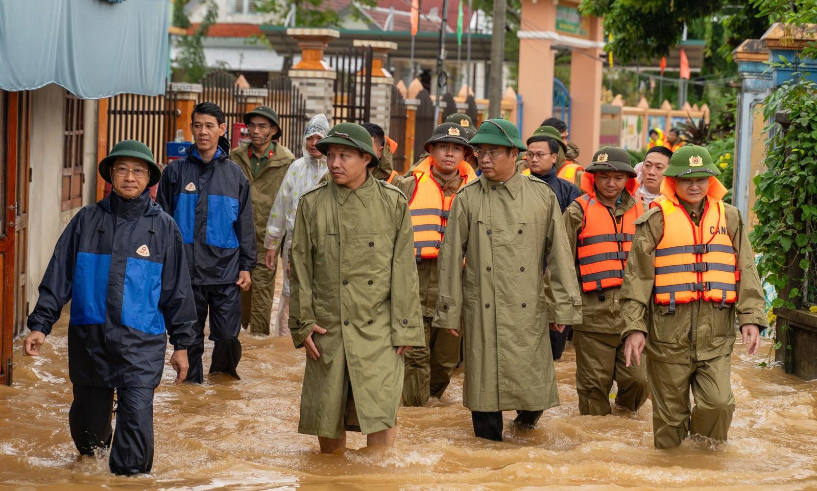 Phó Bí thư Thường trực Thành ủy Huế Phạm Đức Tiến cùng các lực lượng chức năng kiểm tra, chỉ đạo công tác phòng chống mưa lũ tại phường Phú Bài, TP Huế. Ảnh: CATP Huế