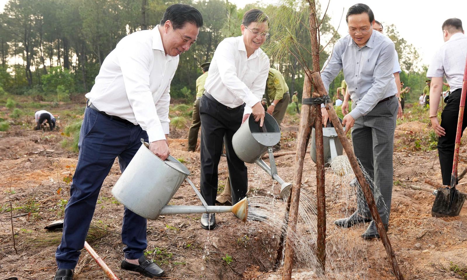 Lãnh đạo thành phố Huế tham gia trồng cây tại lễ phát động. Ảnh: NH