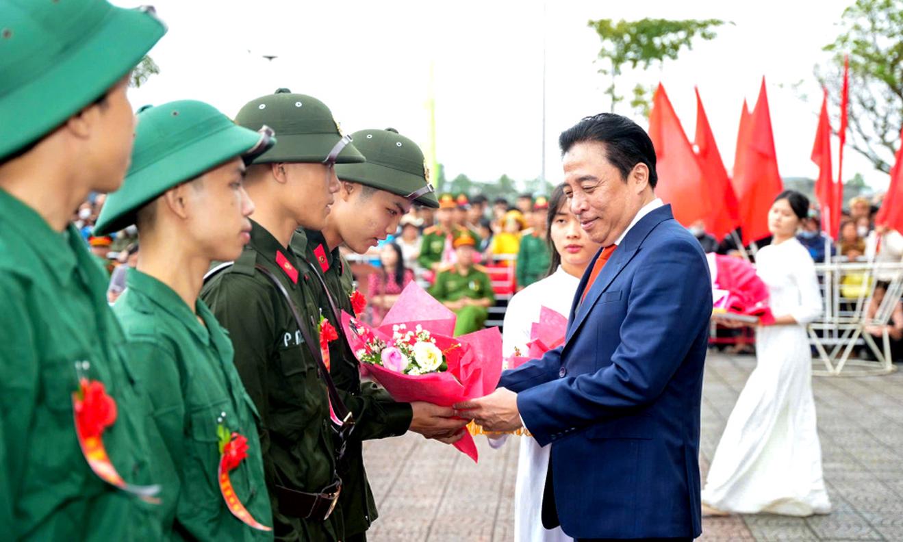 Chủ tịch UBND TP Huế Nguyễn Khắc Toàn tặng hoa chúc mừng các thanh niên lên đường nhập ngũ. Ảnh: CTV