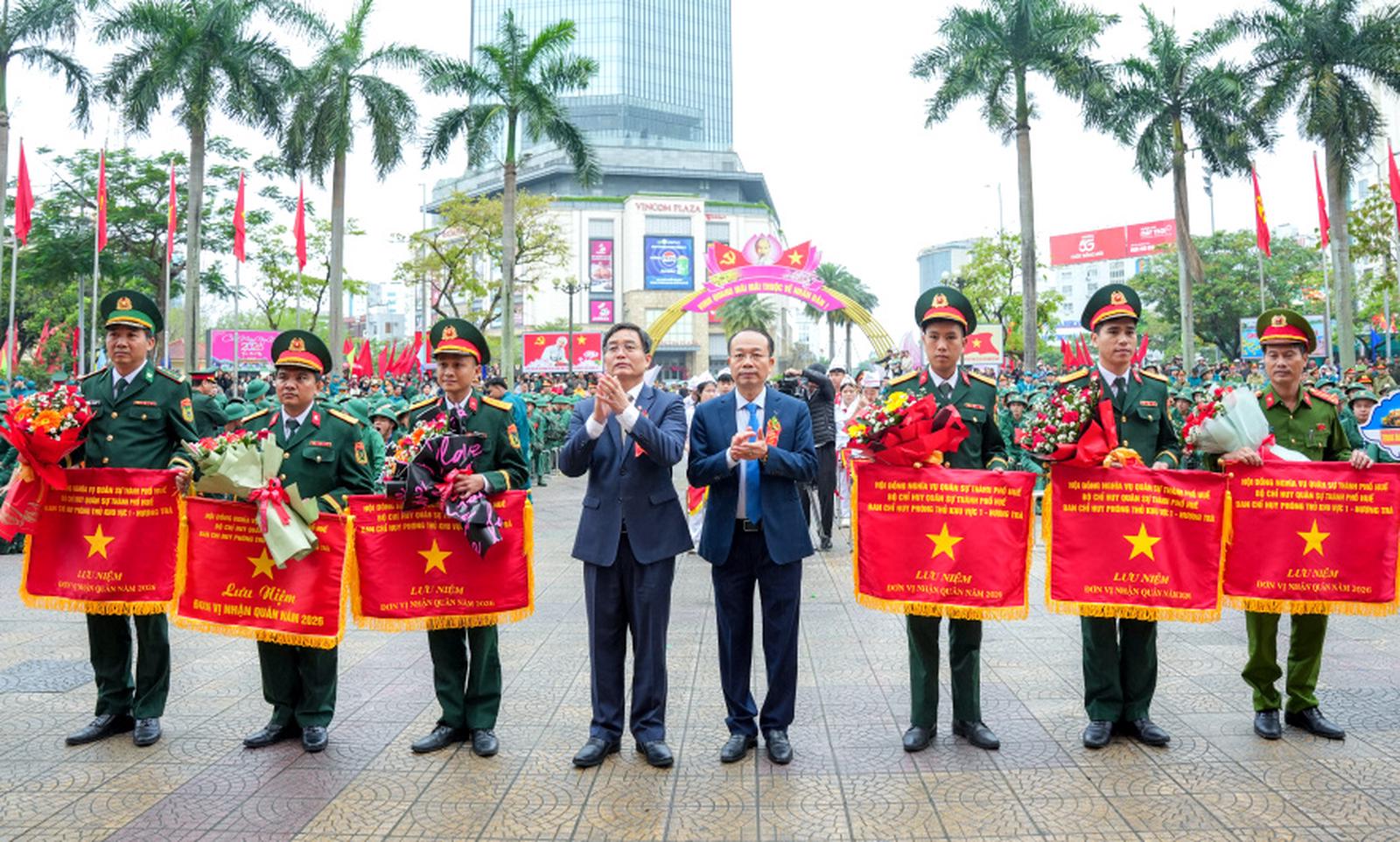 Lễ giao, nhận quân năm 2026 của TP Huế được tổ chức đồng loạt tại 5 điểm trên địa bàn thành phố. Trong không khí trang trọng, phấn khởi của ngày hội tòng quân, các tân binh đã hăng hái lên đường làm nhiệm vụ, thể hiện tinh thần trách nhiệm và niềm tự hào của tuổi trẻ đối với Tổ quốc.