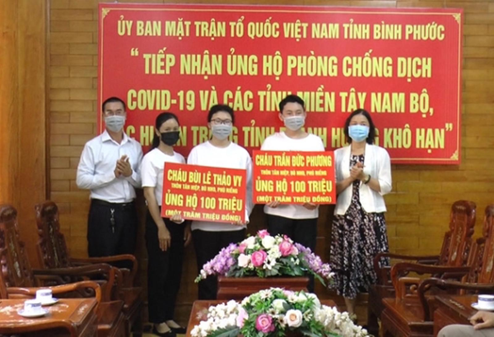 Hay các em Trần Phúc Nguyên, Trần Nhã Uyên, Trần Hoàng Bách, Trường THCS Chu Văn An (Hà Nội) và cháu Trần Hoàng An đã đến Mặt trận Tổ quốc Việt Nam để ủng hộ 50 triệu đồng…