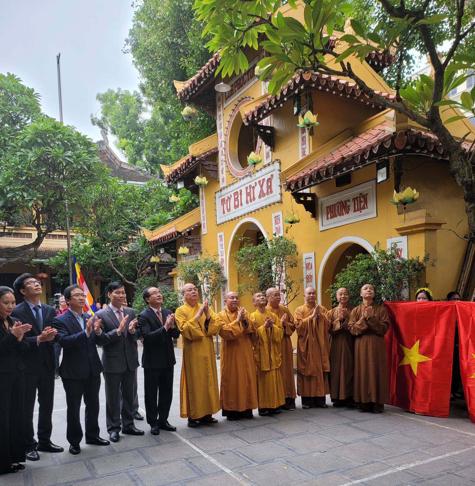 Chư tôn đức lãnh đạo Giáo hội Phật giáo Việt Nam trong lễ thượng cờ Tổ quốc tại chùa Quán Sứ