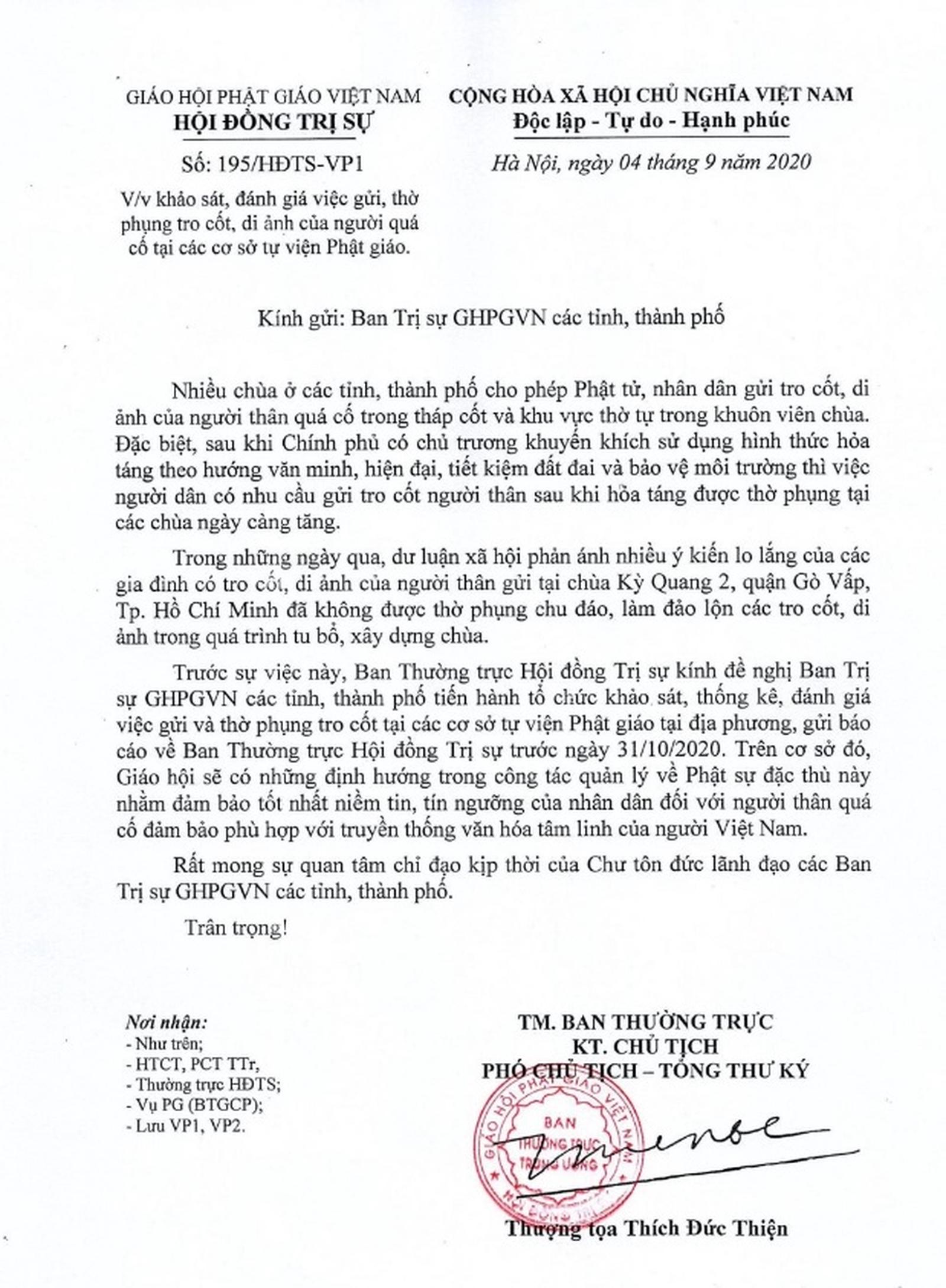 Trung ương Giáo hội Phật giáo Việt Nam (GHPGVN) vừa ban hành Công văn số 195/HĐTS-VP1 ngày 4/9/2020