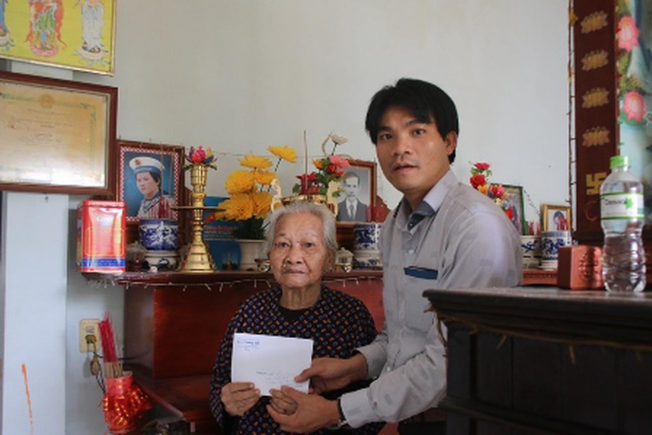 Đại diện Báo Công an TP Hồ Chí Minh và cán bộ Trung đoàn E83 trao 5 triệu đồng cho gia đình bà Hồ Thị Lai, mẹ liệt sĩ Trương Quốc Hùng. Ảnh: Ngọc Phó