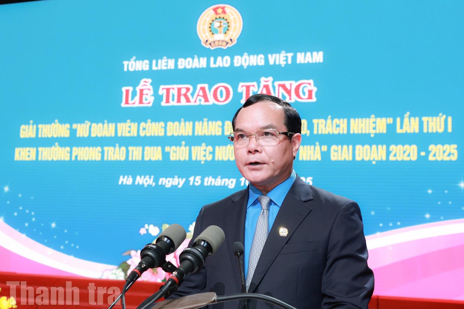 Chủ tịch Tổng LĐLĐ Việt Nam Nguyễn Đình Khang phát biểu tại lễ trao giải. Ảnh: NĐ