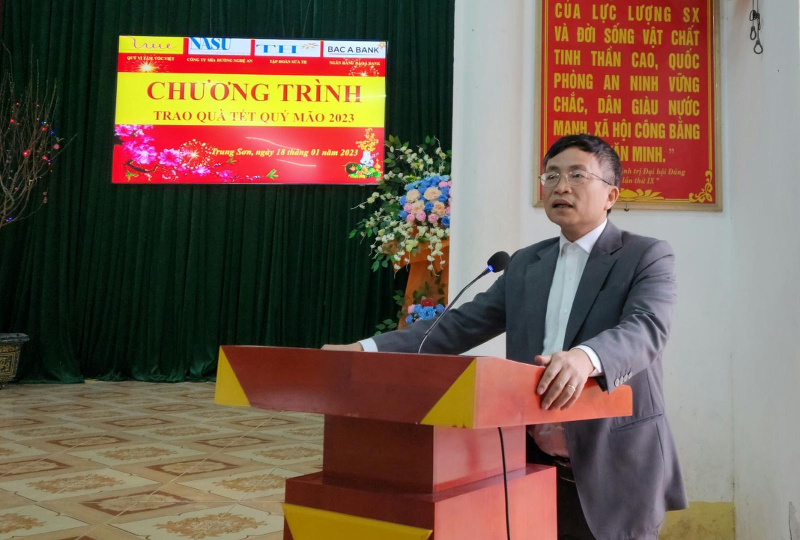Phát biểu tại chương trình, bà Hoàng Thị Hồng Hạnh - Bí thư Đảng ủy xã Trung Sơn, đại biểu HĐND tỉnh Nghệ An gửi lời cảm ơn đến cá nhân ông Trần Đăng Vinh đã dành tình cảm với quê hương thông qua việc kết nối, kêu gọi các nhà hảo tâm, mạnh thường quân để đến với địa phương, mang đến tình cảm và nghĩa cử cao đẹp hướng về hộ nghèo, hộ cận nghèo và gia đình chính sách, người dân có hoàn cảnh khó khăn trên địa bàn xã.