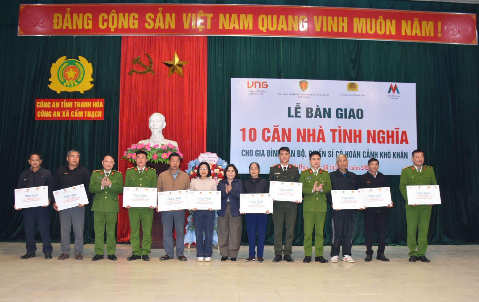 (Thanh tra) - Ngày 27/1, Công an tỉnh Thanh Hoá thông tin, sáng 26/1, tại xã Cẩm Thạch, tỉnh Thanh Hoá, Cục Cảnh sát Quản lý hành chính (QLHC) về trật tự xã hội (TTXH), Bộ Công an phối hợp với Tập đoàn VNG và Công an tỉnh tổ chức Lễ bàn giao, trao tặng 10 căn nhà tình nghĩa cho gia đình cán bộ, chiến sĩ Công an Thanh Hoá có hoàn cảnh đặc biệt khó khăn, với tổng kinh phí khoảng 1,3 tỷ đồng.