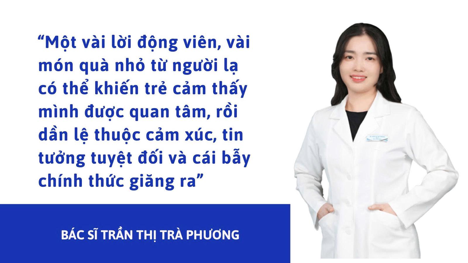Bác sĩ Phương cảnh báo: "Một vài lời động viên, vài món quà nhỏ từ người lạ có thể khiến trẻ cảm thấy mình được quan tâm, rồi dần lệ thuộc cảm xúc, tin tưởng tuyệt đối và cái bẫy chính thức giăng ra".