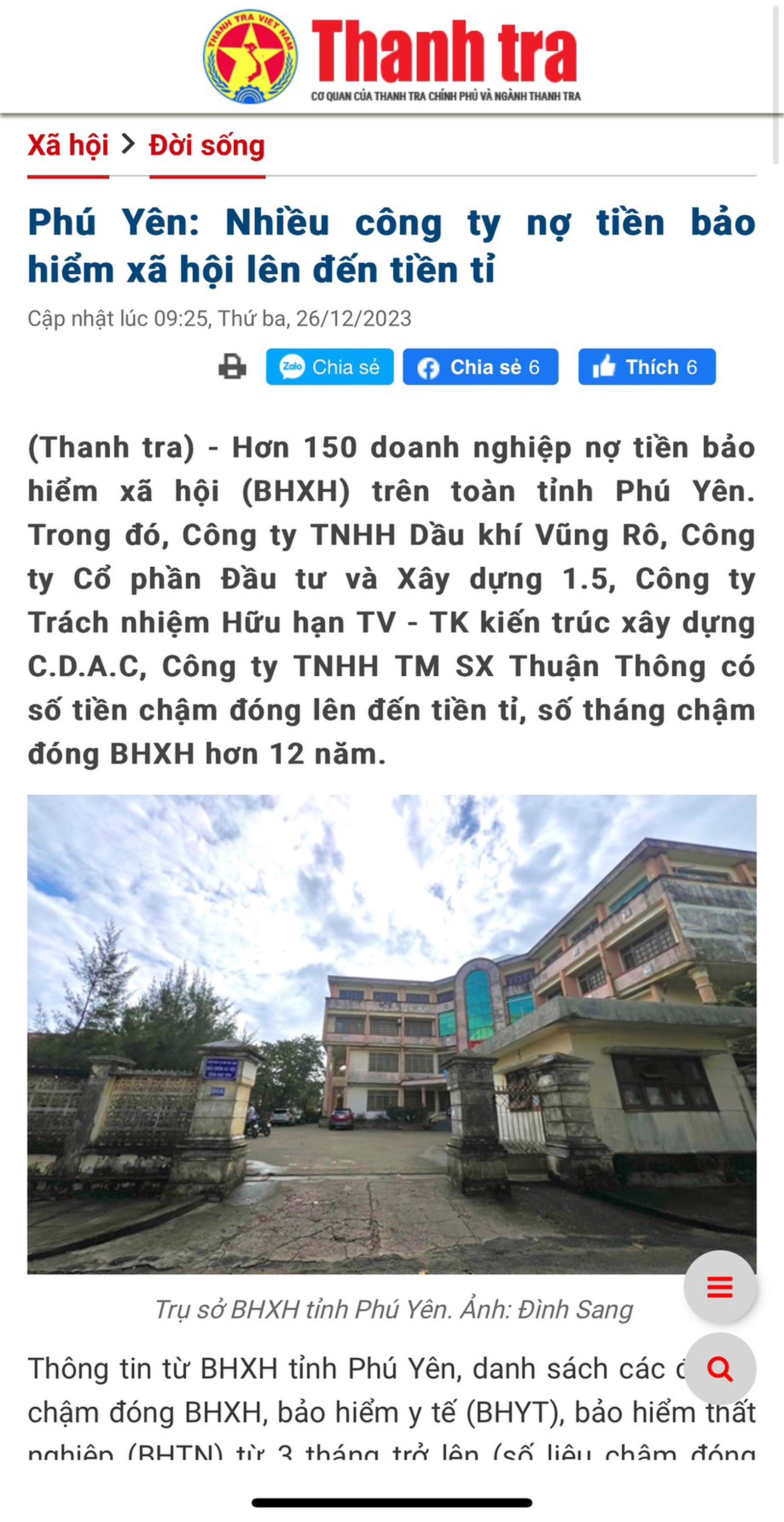 Ngày 26/12/2023, Báo Thanh tra đã đăng tải bài viết “Phú Yên: Nhiều công ty nợ tiền BHXH lên đến tiền tỉ”. Ảnh: Đình Sang