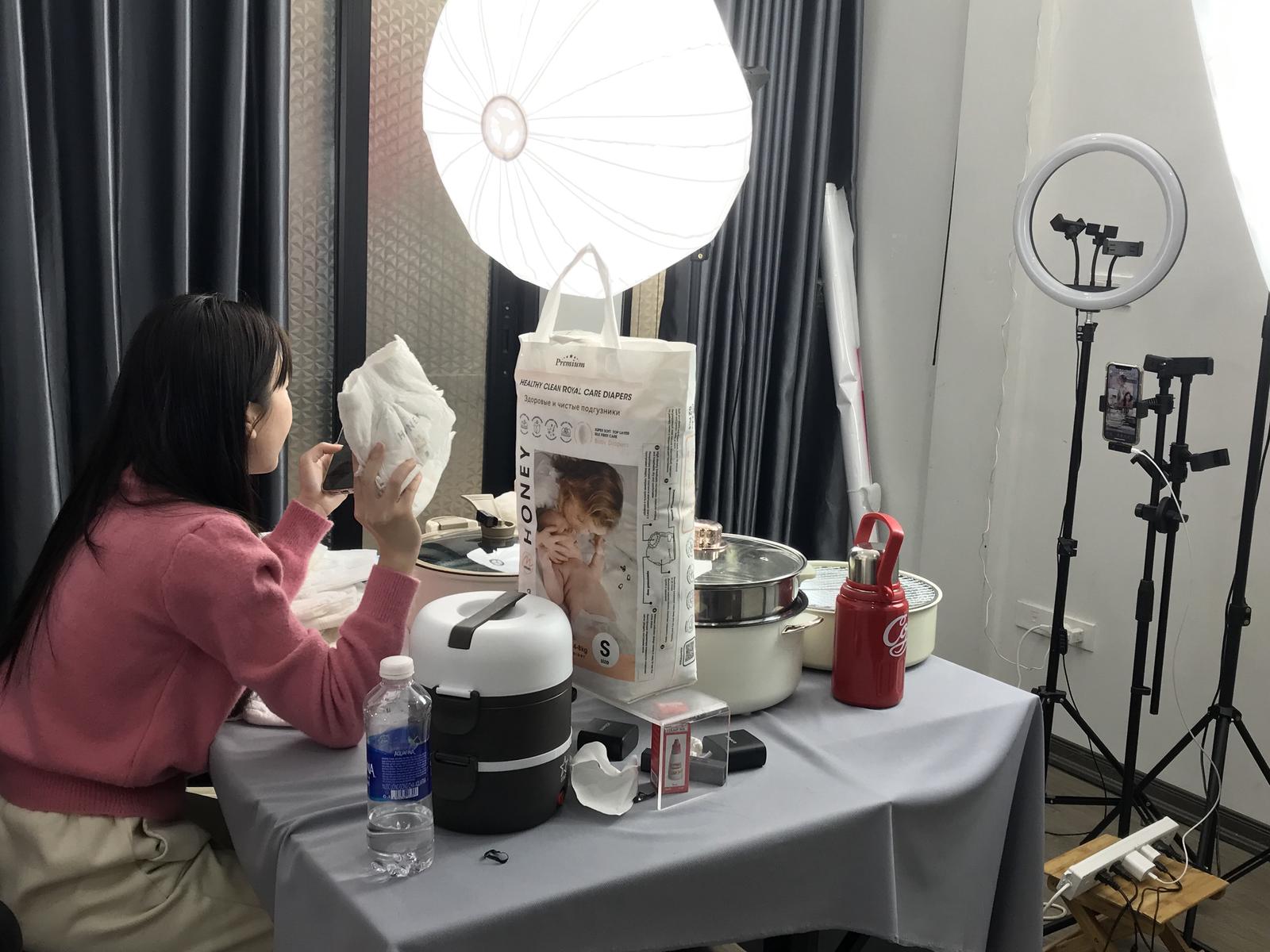 Phương Thảo giới thiệu sản phẩm trong một buổi livestream bán tã bỉm, cố duy trì không khí sôi động để thu hút khách hàng. Ảnh: Lê Linh