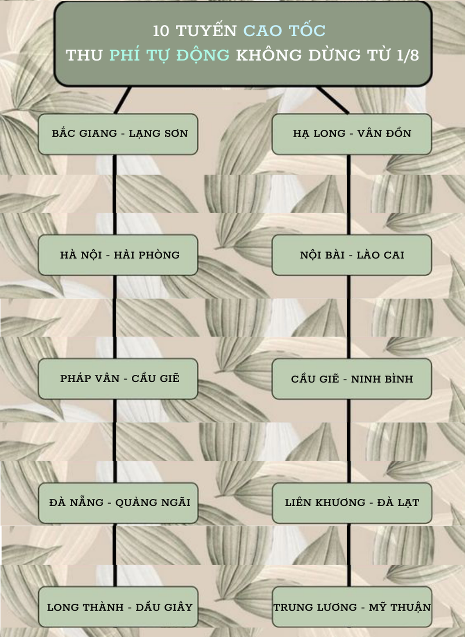 Cụ thể: Tuyến cao tốc Bắc Giang - Lạng Sơn; Hạ Long - Vân Đồn; Hà Nội - Hải Phòng; Nội Bài - Lào Cai; Pháp Vân - Cầu Giẽ; Cầu Giẽ - Ninh Bình; Đà Nẵng - Quảng Ngãi; Liên Khương - Đà Lạt; Long Thành - Dầu Giây và Trung Lương - Mỹ Thuận.