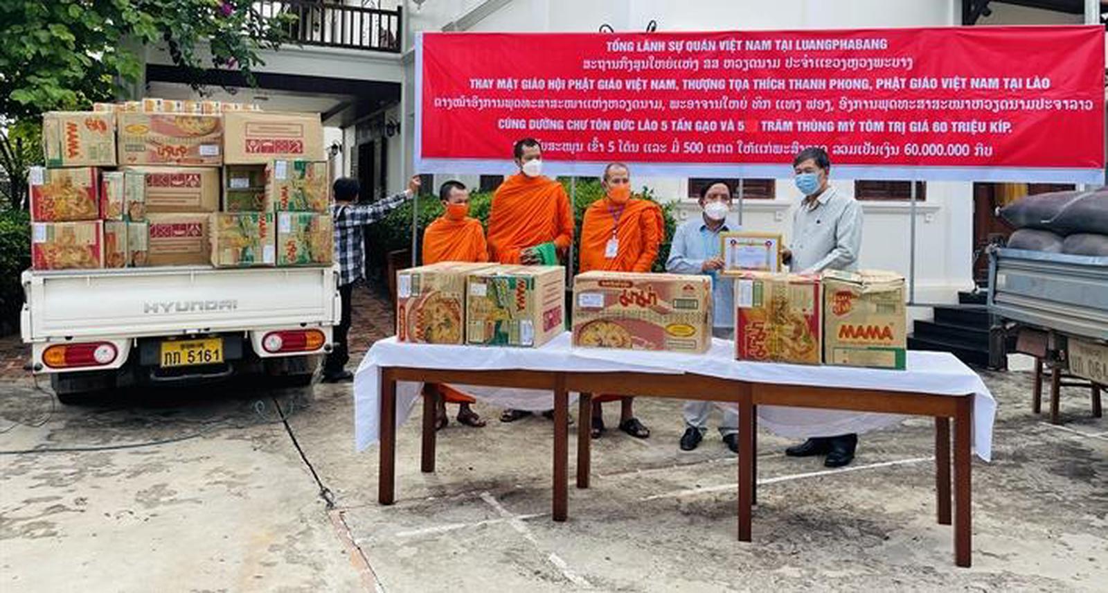 Giáo hội Phật giáo Việt Nam quyên tặng Liên minh Trung ương Giáo hội Phật giáo Lào các phần gạo và mỳ để vượt qua khó khăn do đại dịch Covid-19 gây ra. Ảnh: bienphong.com.vn