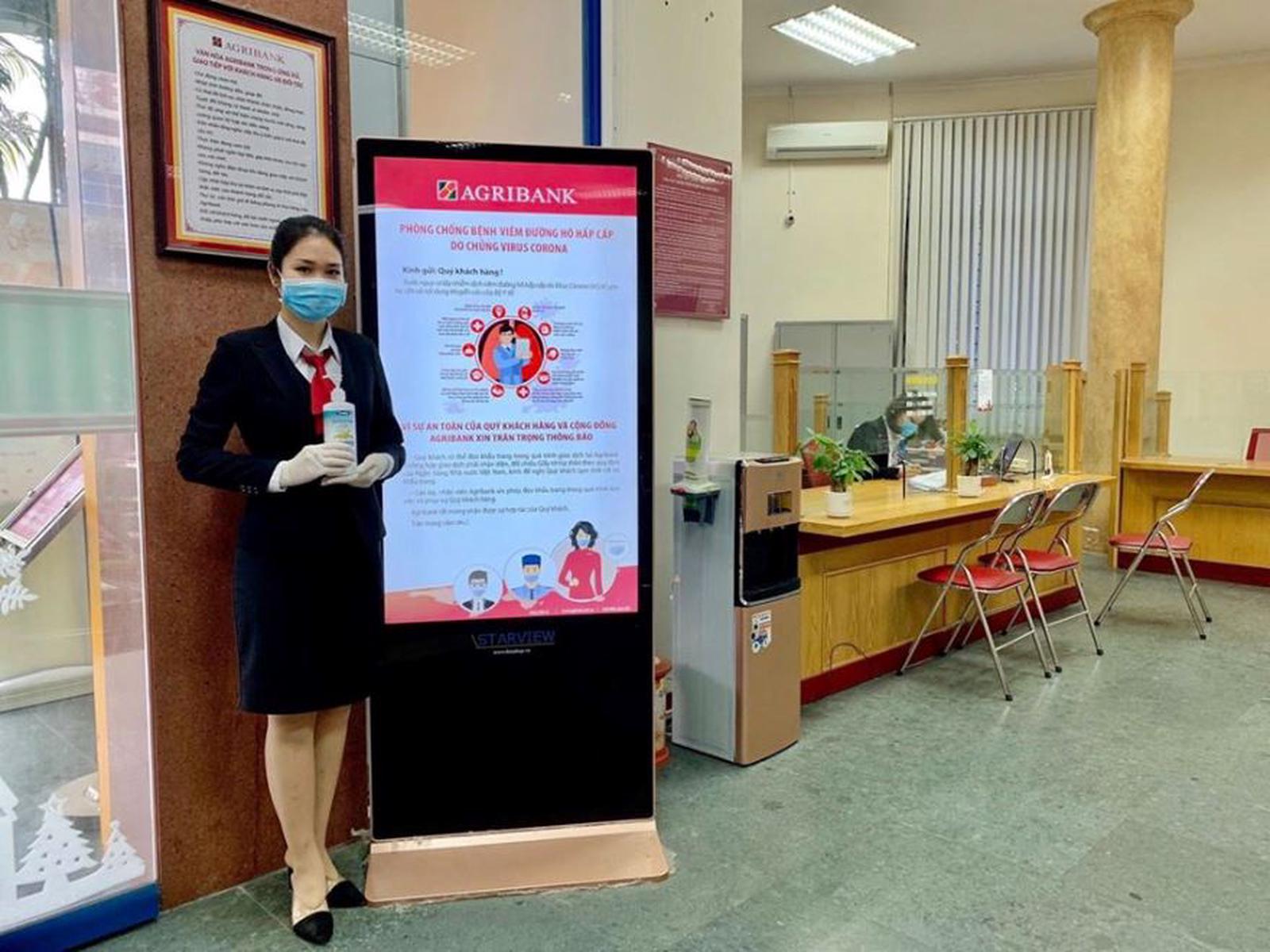 Các phòng giao dịch của Agribank luôn được đảm bảo tiêu chuẩn sạch sẽ, Agribank cũng tiên phong trong hệ thống ngân hàng sát trùng các địa điểm đặt máy ATM và để nước sát khuẩn tại các máy ATM để phục vụ khách hàng khi đến giao dịch tại ATM.