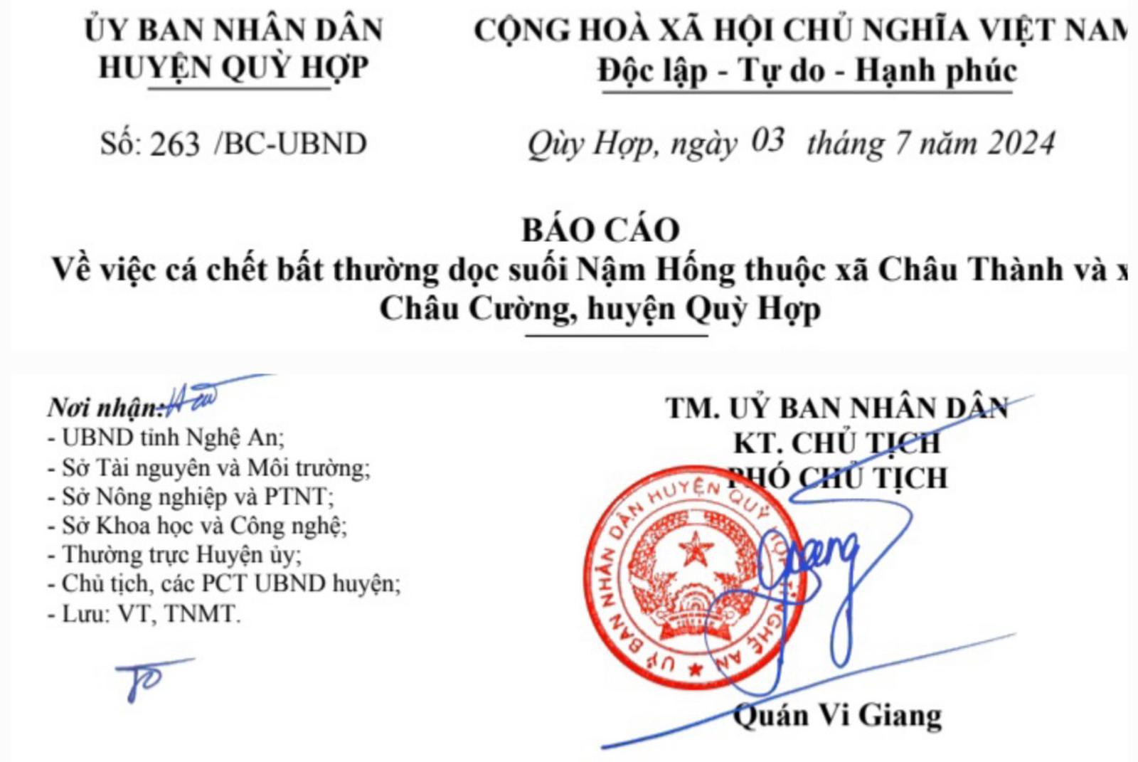 Báo cáo của UBND huyện Quỳ Hợp về cá chết bất thường trên địa bàn. Ảnh: Châu Yên