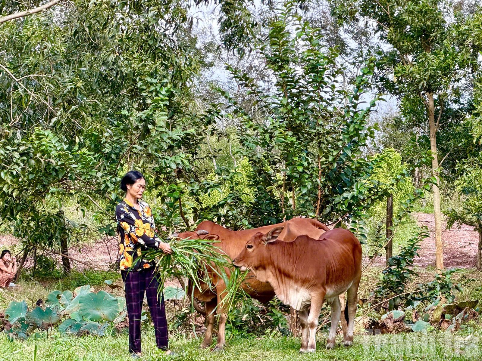 Nhờ tiếp cận thông tin, vốn vay ưu đãi và hỗ trợ bò giống từ chương trình giảm nghèo, gia đình chị Đỗ Thị Hồng (thôn 1, xã Hòa Sơn, Đắk Lắk) đã mạnh dạn thay đổi cách làm và chính thức thoát nghèo. Ảnh: NG
