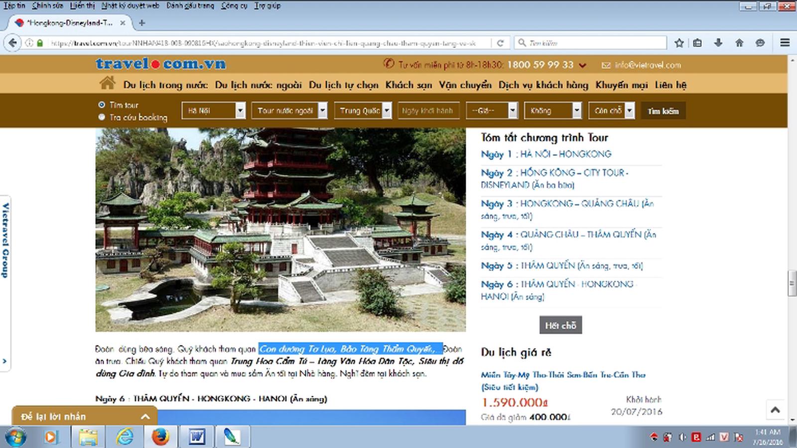 Ảnh chụp màn hình trang web của Vietravel tối 15/7: Khách bị cắt nội dung tham quan “công viên Liên Hoa Sơn, tượng Đặng Tiểu Bình) song không thấy LH bổ sung cảnh điểm thay thế