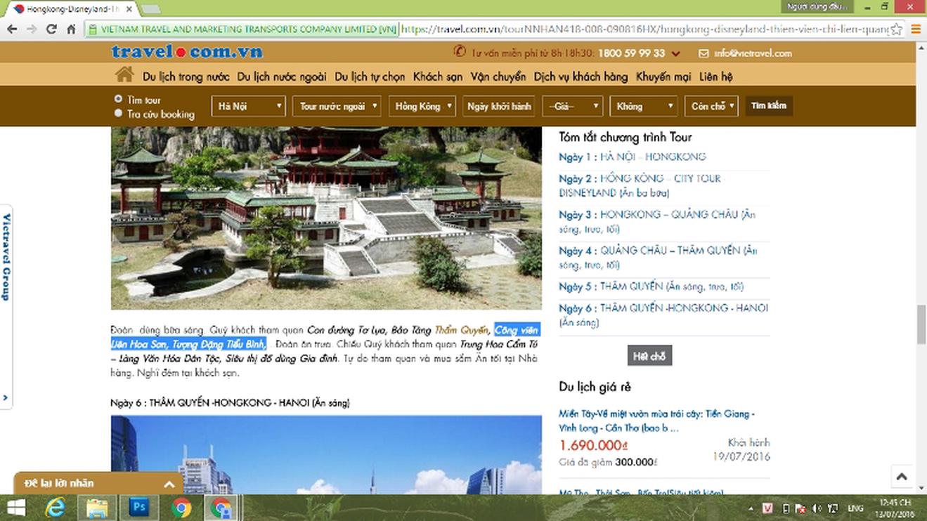 Thông tin (phần bôi xanh) chào bán tour Hà Nội - Hongkong - Quảng Châu - Thâm Quyến trên trang web của Vietravel: "Quý khách tham quan Con đường tơ lụa, bảo tàng Thâm Quyến, công viên Liên Hoa Sơn, tượng Đặng Tiểu Bình...".