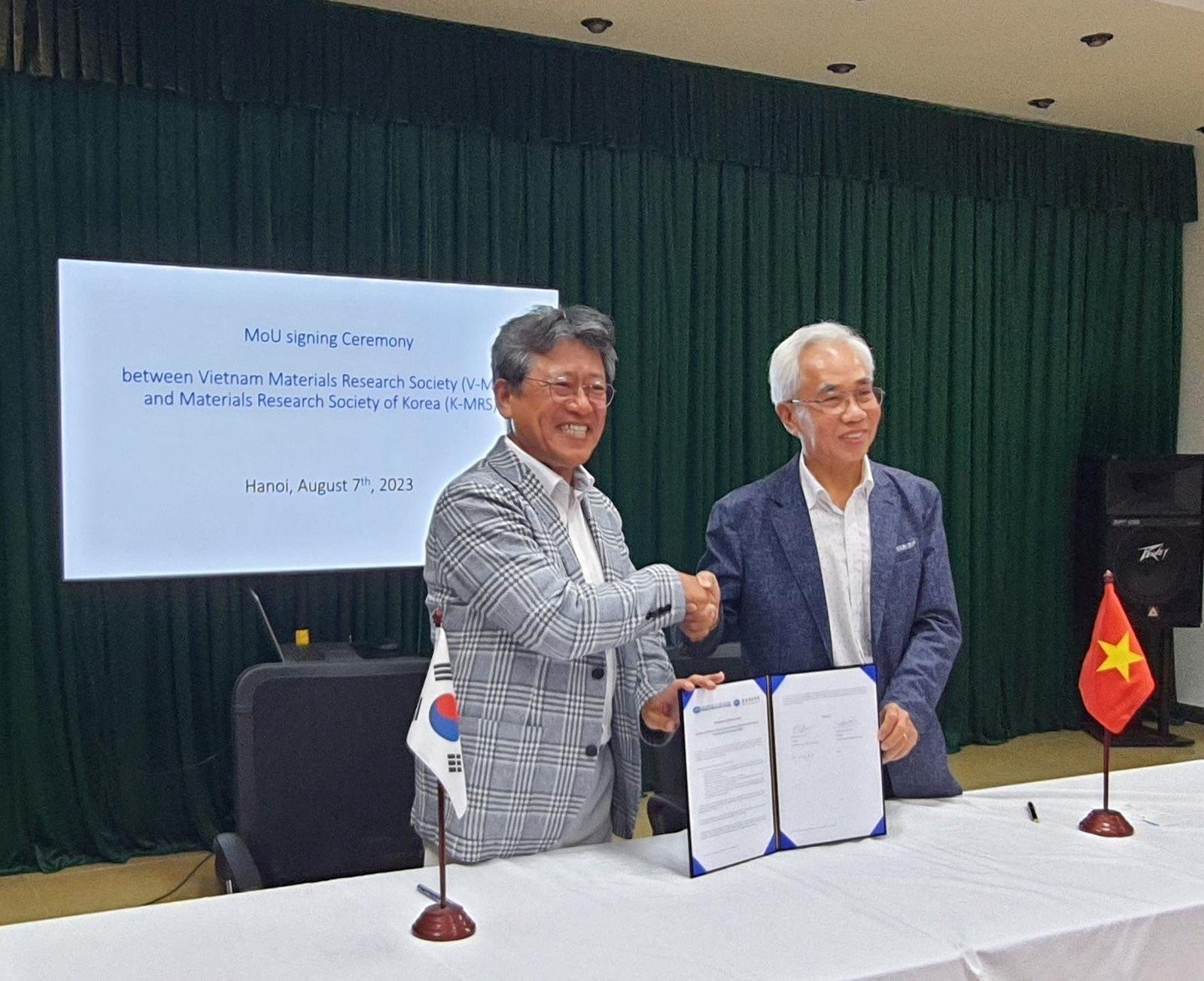 GS. Nguyễn Đức Chiến (phải) tại Lễ ký Biên bản ghi nhớ về hợp tác giữa Hội Khoa học Vật liệu Việt Nam và Hội Khoa học Vật liệu Hàn Quốc, tháng 8/2023. (Ảnh: V-MRS)