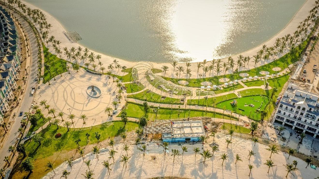Bờ cát trắng tuyệt đẹp bao quanh hồ được tạo nên từ hàng trăm tấn cát từ vịnh biển Nha Trang, trải qua những công đoạn sàng sẩy, trải nhiều lớp để mang đến cảnh sắc chân thực, sống động nhất. Cùng với đó là hàng trăm gốc dừa, hoa và cây xanh được trồng dọc theo cung đường cát trắng, xen kẽ cùng những cụm cảnh quan điểm nhấn quy mô như biểu tượng xương cá voi, biểu tượng artwork, quảng trường sự kiện...Dưới lòng hồ, hơn 50 tấn cá cũng được thả xuống lòng hồ để làm phong phú sinh quyển lòng hồ và có thêm hoạt động giải trí, thư giãn cho cư dân.