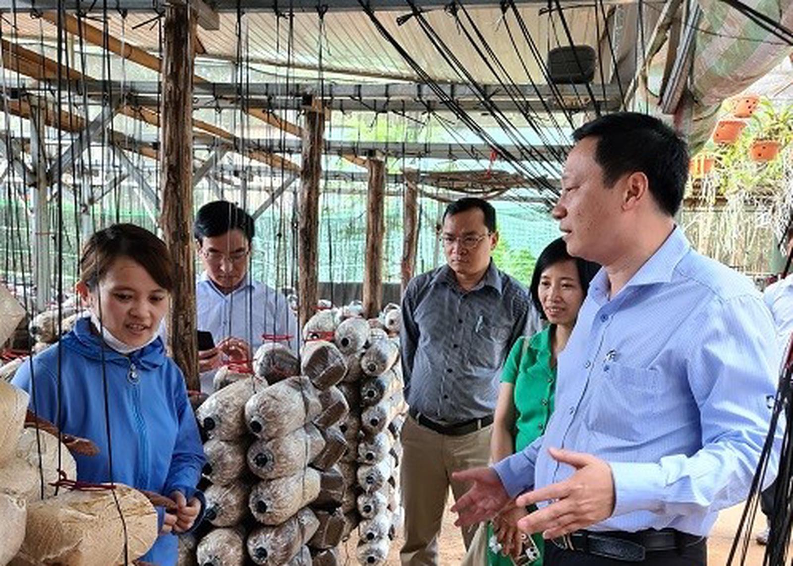 Phó Trưởng ban Ban Thi đua - Khen thưởng Trung ương Phạm Đức Toàn (phải ảnh) cùng Đoàn Giám sát khảo sát mô hình sản xuất nấm sò và nấm linh chi của hộ gia đình ông bà Đặng Đình Tấn - Nguyễn Thị Hoài Phương, khu phố 3, thị trấn Phú Hòa, Chư Păh, Gia Lai . Ảnh: Nguyệt Hà