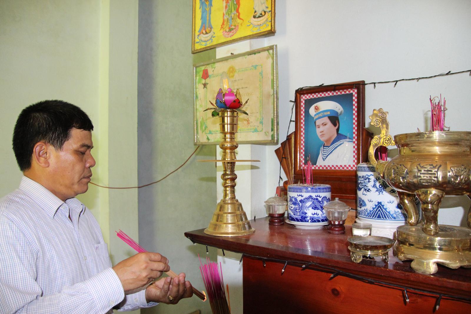 Dẫn chúng tôi lên lầu hai của căn nhà khang trang, ông Lê Văn Xuân thắp nén nhang đưa cho tôi, bảo: “Nó hi sinh năm 20 tuổi. Trước ngày đi đảo, tui bảo lấy vợ rồi đi con. Nó hứa trong ngày nhập ngũ “Hoàn thành nghĩa vụ con sẽ về lấy vợ sinh con cho ba”. Nhưng mãi mãi chẳng thấy nó về”.
