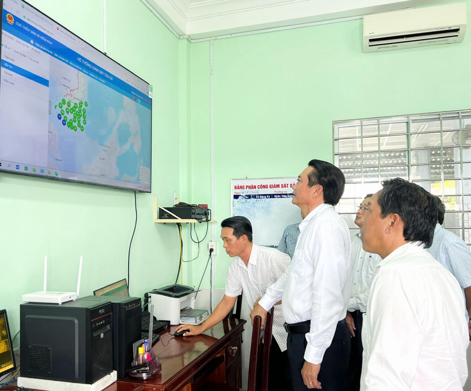 Phó Chủ tịch UBND tỉnh, Trưởng Ban Chỉ đạo về IUU tỉnh - Nguyễn Quỳnh Thiện kiểm tra phòng theo dõi hoạt động tàu cá trên biển, tại Cảng cá Bình Đại. Ảnh: Trần Quốc