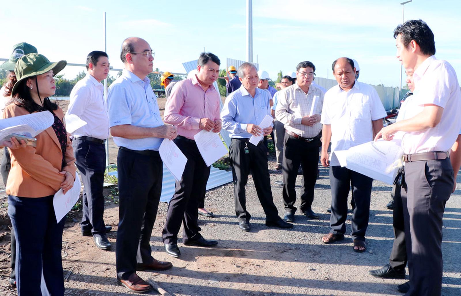 Đoàn công tác khảo sát thực tế thi công dự án hạ tầng hồ chứa nước ngọt dọc bờ sông Láng Thé (giai đoạn 1). Ảnh: ST