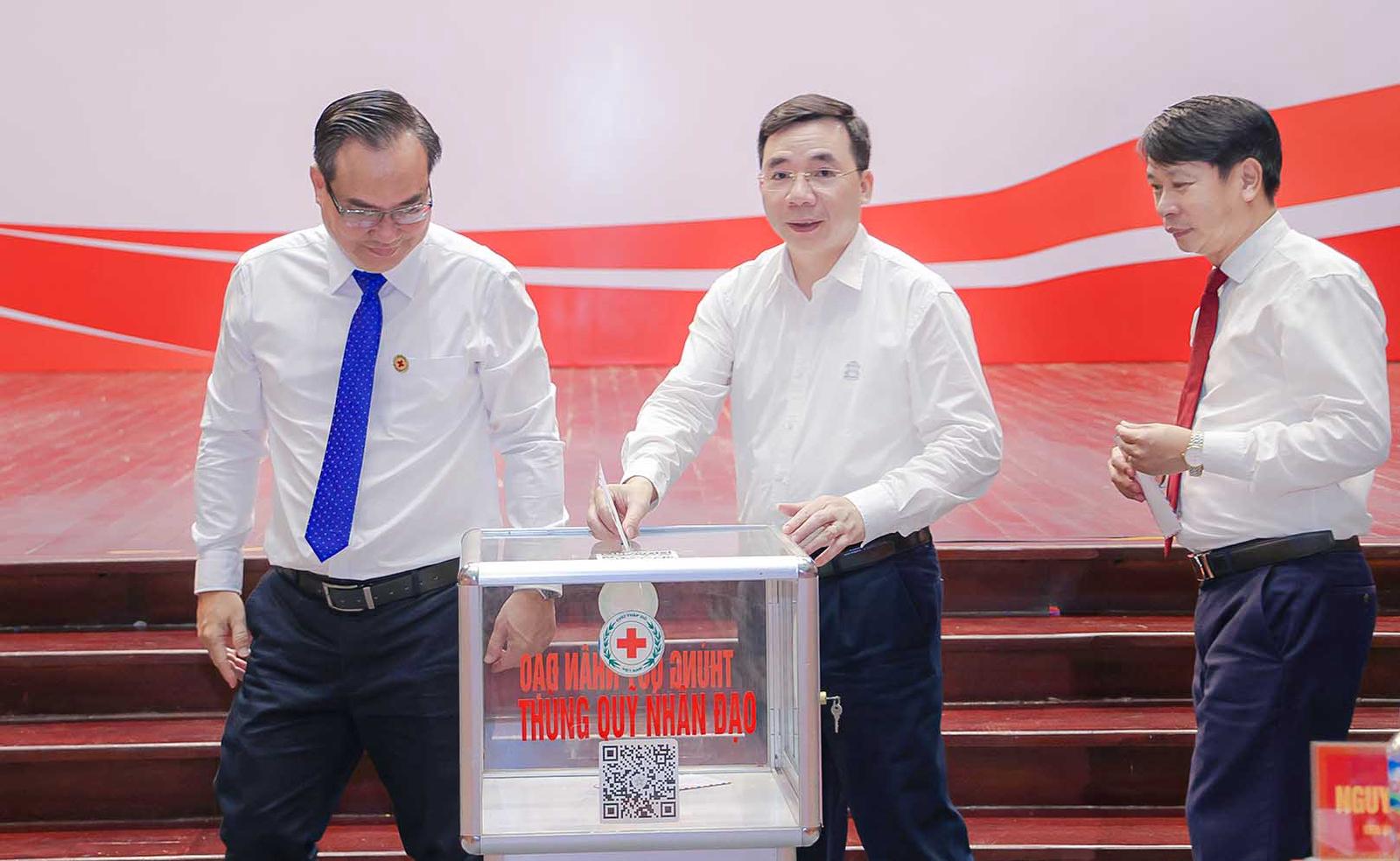 Phó Bí thư Thường trực Tỉnh ủy Bùi Huy Vĩnh và các đại biểu tham gia ủng hộ "Tháng Nhân đạo" năm 2025. Ảnh: Trà Hương – Dương Chung