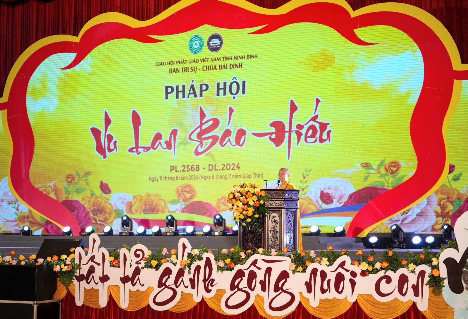 Thay mặt ban tổ chức, thượng tọa Thích Minh Quang - ủy viên Hội đồng Trị sự Giáo hội Phật giáo Việt Nam, chứng minh Ban Trị sự Phật giáo tỉnh Ninh Bình - chia sẻ những thông tin để các phật tử và du khách thập phương hiểu thêm về nguồn gốc và ý nghĩa của lễ Vu lan.