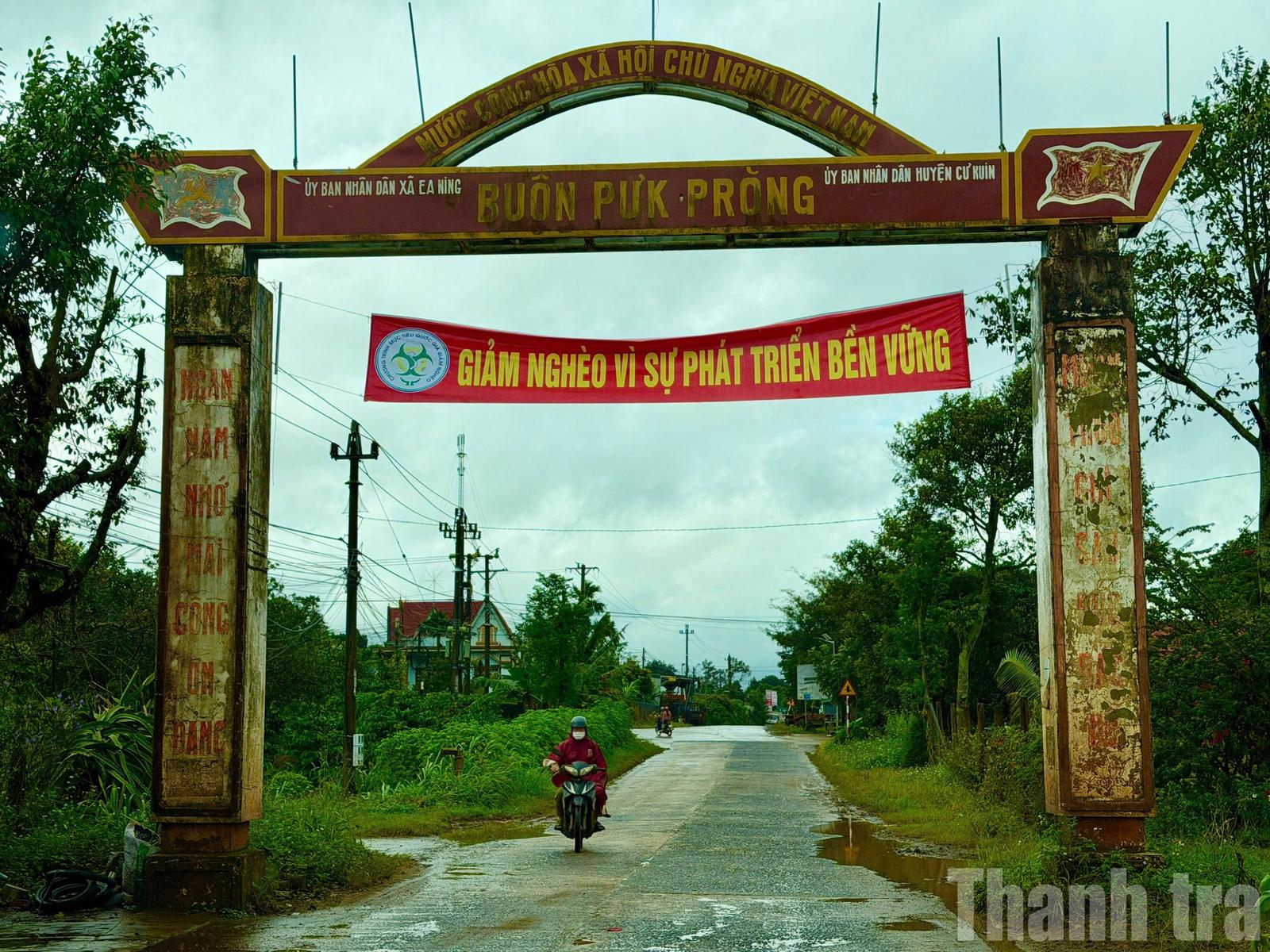 Cổng chào buôn Púk Prông (xã Ea Ning, Đắk Lắk) với khẩu hiệu “Giảm nghèo vì sự phát triển bền vững”, thể hiện quyết tâm của địa phương trong thực hiện Chương trình giảm nghèo đa chiều. Ảnh: NG