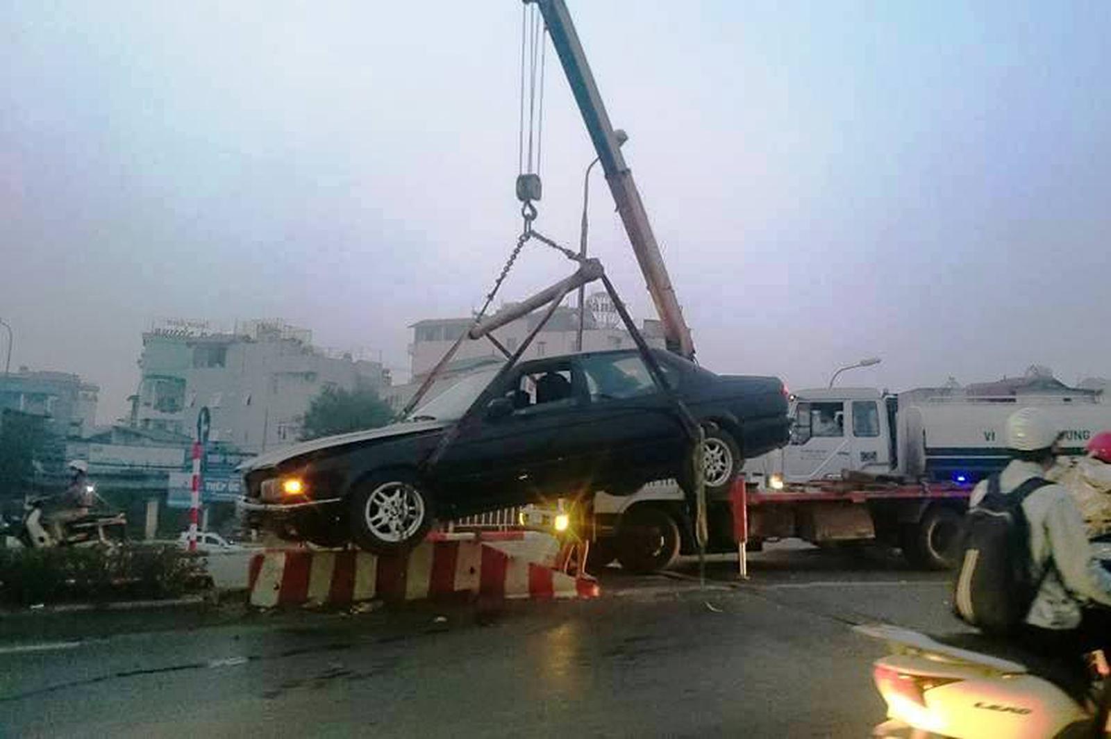 Gần 30 phút sau, lực lượng cứu hộ có mặt để cẩu chiếc xe ra khỏi dải phân cách, đưa về khu vực an toàn. Sau cú va chạm, phần đầu xe không hư hại nhiều.