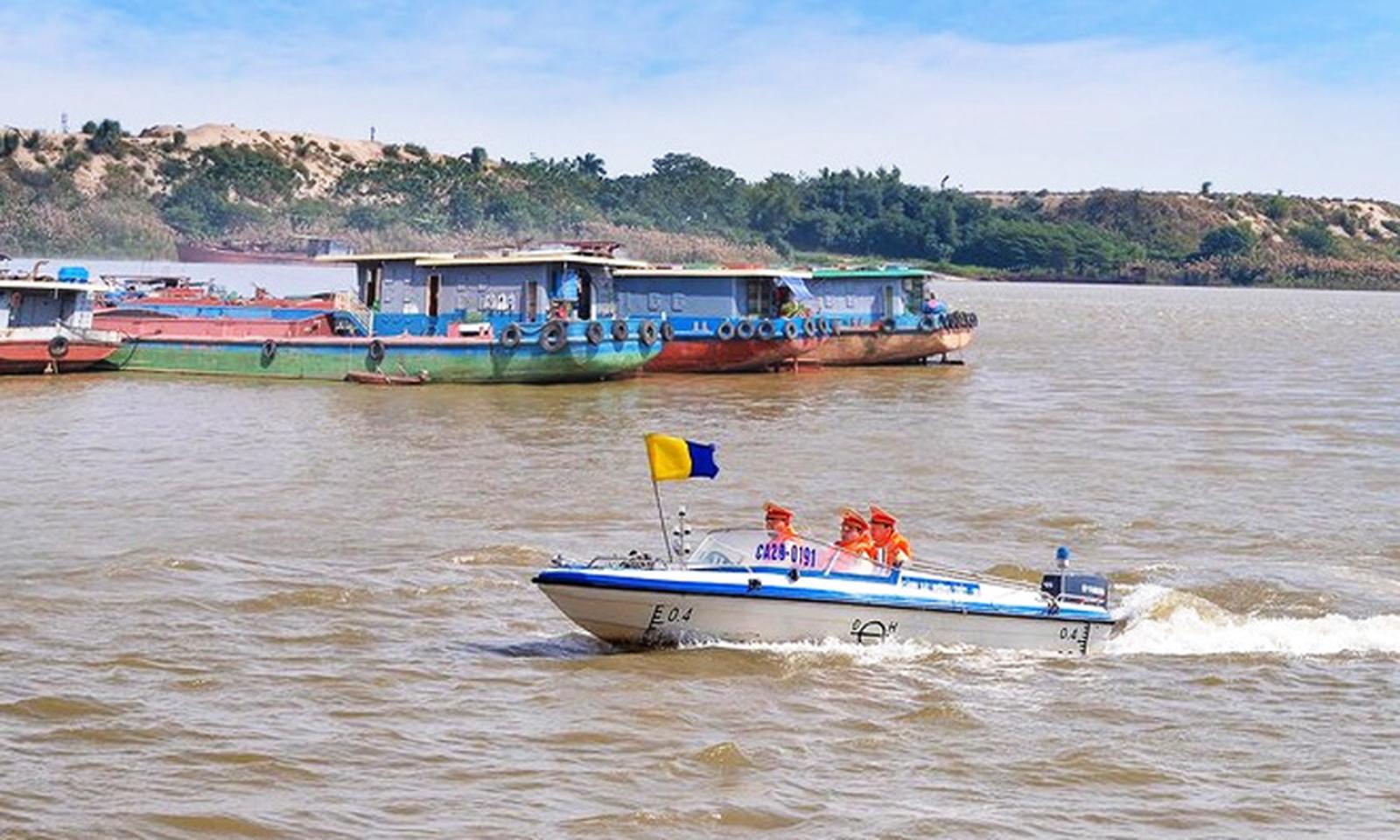 CSGT đường thủy tiến hành thả phao, đèn báo và hướng dẫn phương tiện thủy qua đoạn sông Hồng nơi chiếc xe container vẫn chưa được trục vớt