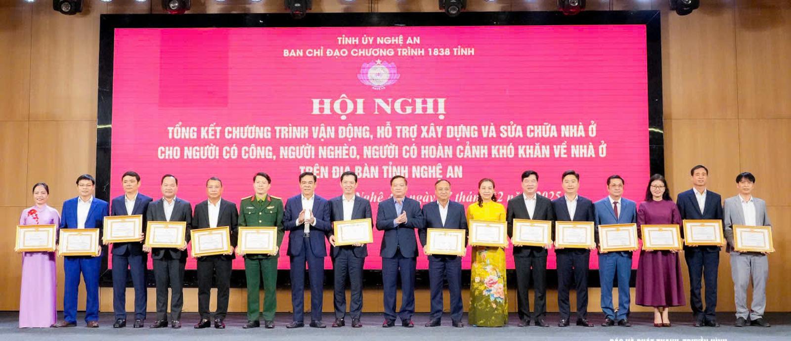 Ngày 17/12, Ban Chỉ đạo Chương trình 1838 tỉnh Nghệ An tổ chức hội nghị tổng kết Chương trình vận động, hỗ trợ xây dựng, sửa chữa nhà ở cho người có công, người nghèo, người có hoàn cảnh khó khăn về nhà ở trên địa bàn tỉnh. Hội nghị có sự tham dự của Thiếu tướng Lê Văn Trung – Phó Chính ủy Quân khu 4; Bí thư Tỉnh ủy Nghệ An Nguyễn Khắc Thận; Phó Bí thư Thường trực Tỉnh ủy, Chủ tịch HĐND tỉnh Hoàng Nghĩa Hiếu; Phó Bí thư Tỉnh ủy, Chủ tịch UBND tỉnh Võ Trọng Hải; Phó Bí thư Tỉnh ủy, Chủ tịch Ủy ban MTTQ tỉnh Võ Thị Minh Sinh cùng đông đảo lãnh đạo các ban, sở, ngành, địa phương.