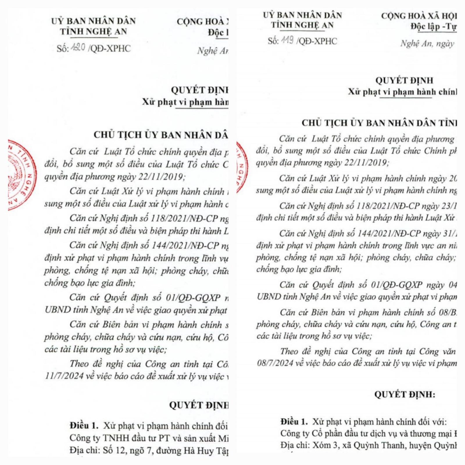 Hai quyết định xử phạt vi phạm hành chính do ông Lê Hồng Vinh, Phó Chủ tịch UBND tỉnh Nghệ An ký ngày 16/7/2024.