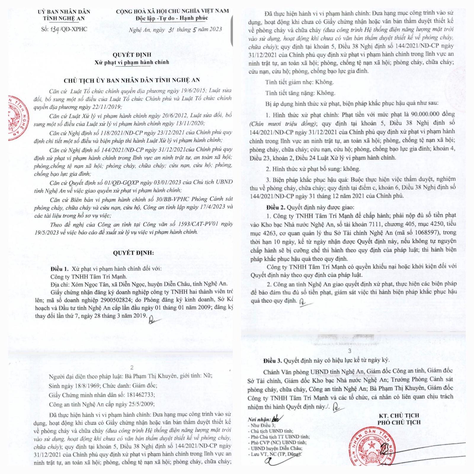 (Thanh tra)- UBND tỉnh Nghệ An vừa ra quyết định xử phạt vi phạm hành chính đối với Công ty TNHH Tâm Trí Mạnh ở huyện Diễn Châu số tiền 90 triệu đồng, do lỗi vi phạm đưa hệ thống điện năng lượng mặt trời vào sử dụng chưa đảm bảo yêu cầu về phòng cháy, chữa cháy (PCCC).