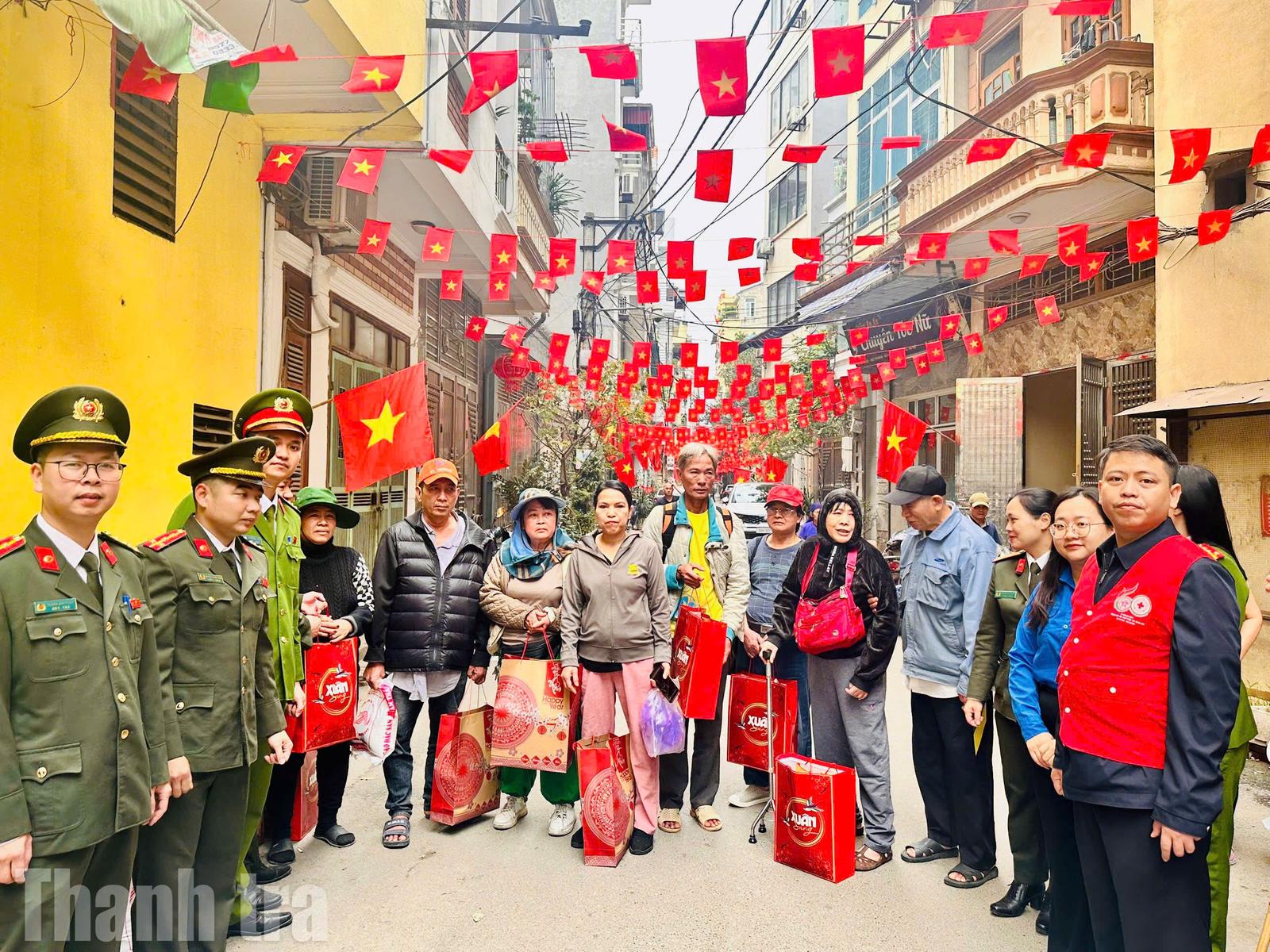 Đại diện các lực lượng phối hợp chụp ảnh lưu niệm trước khi trao quà. 30 suất quà Tết được chuẩn bị chu đáo, gửi đến bà con đang lưu trú trên địa bàn phường Hà Đông. Ảnh: Lan Anh