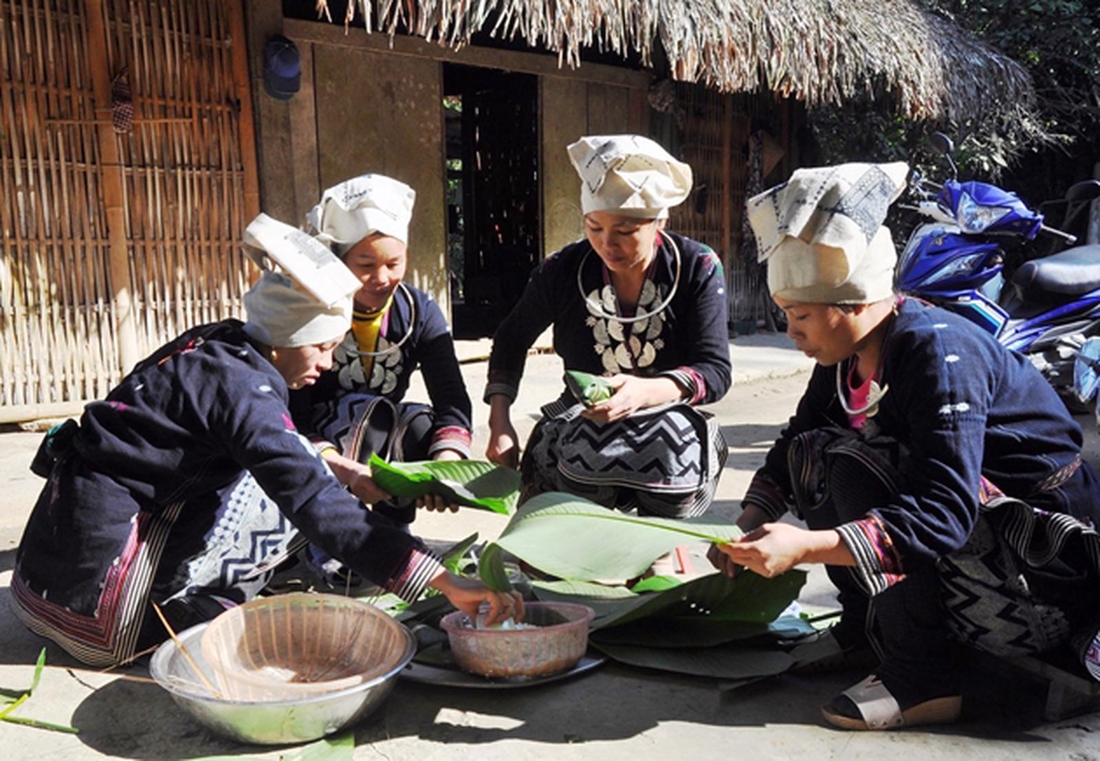 Người Dao ở Bản Pình, xã Trung Minh gói bánh chưng gù chuẩn bị đón Tết. Ảnh: L.Q