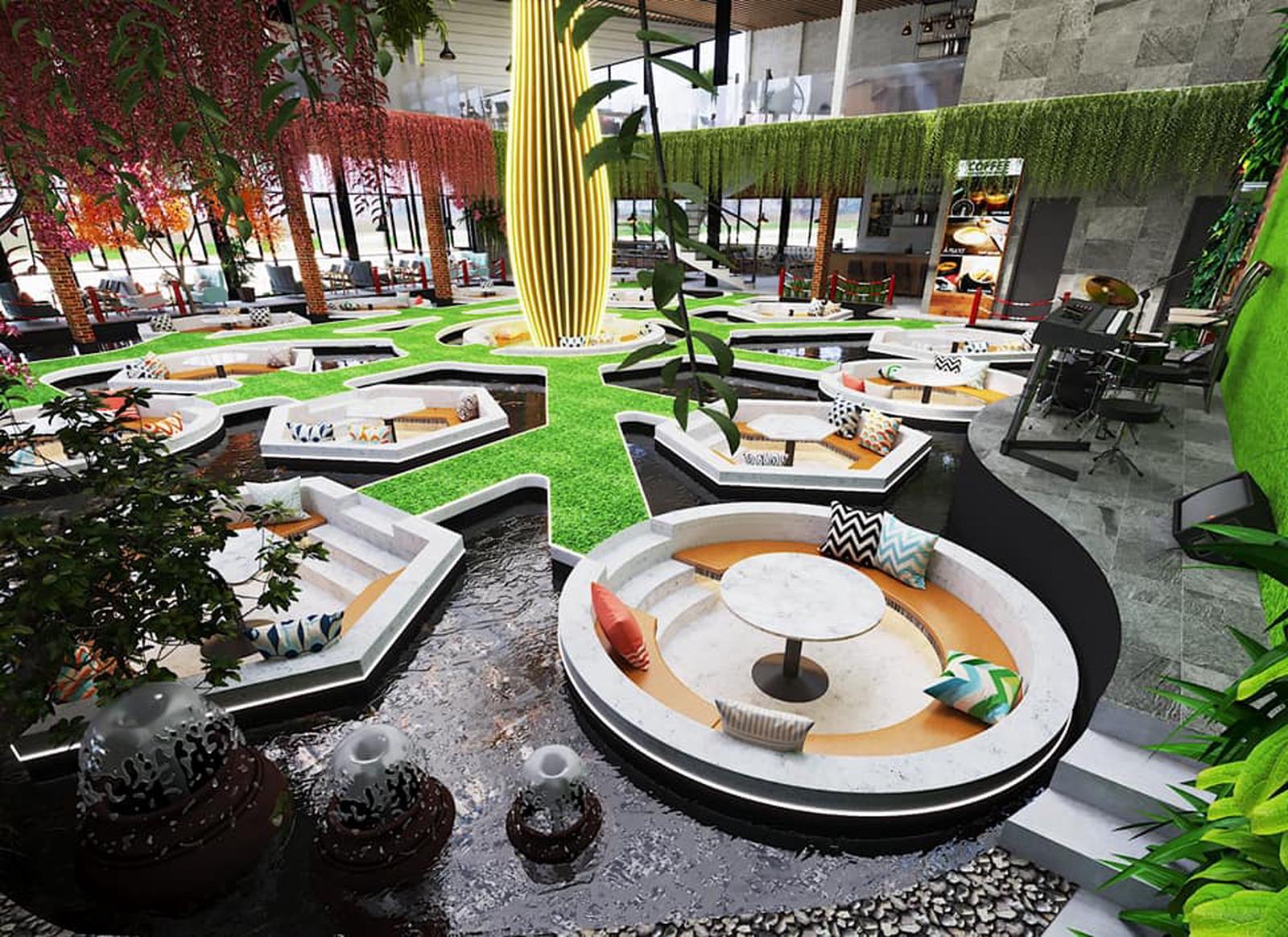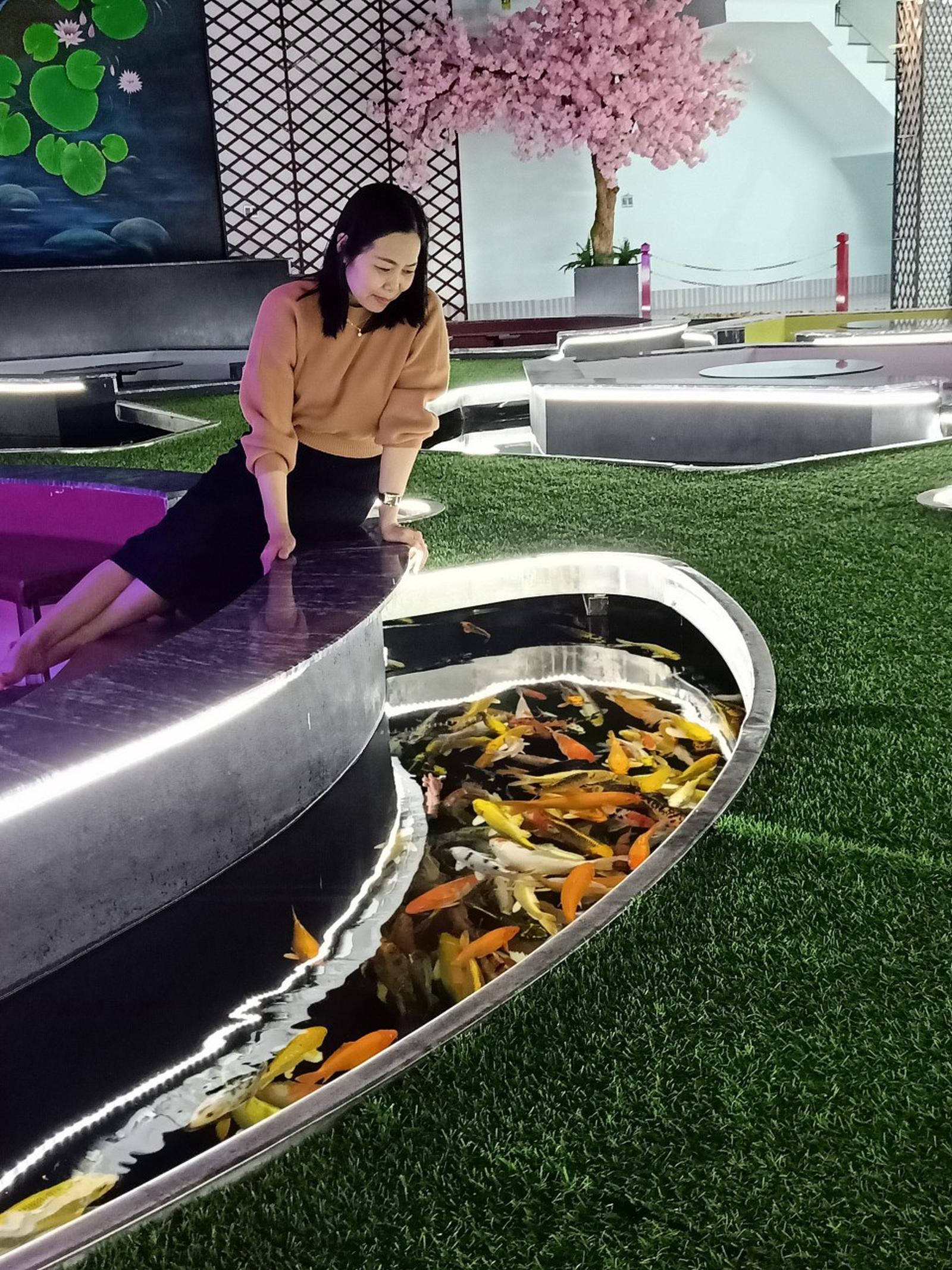 Ngồi uống cà phê, chơi với cá sẽ là điểm nhấn của khu vực Nhà hàng này. Ảnh: VT