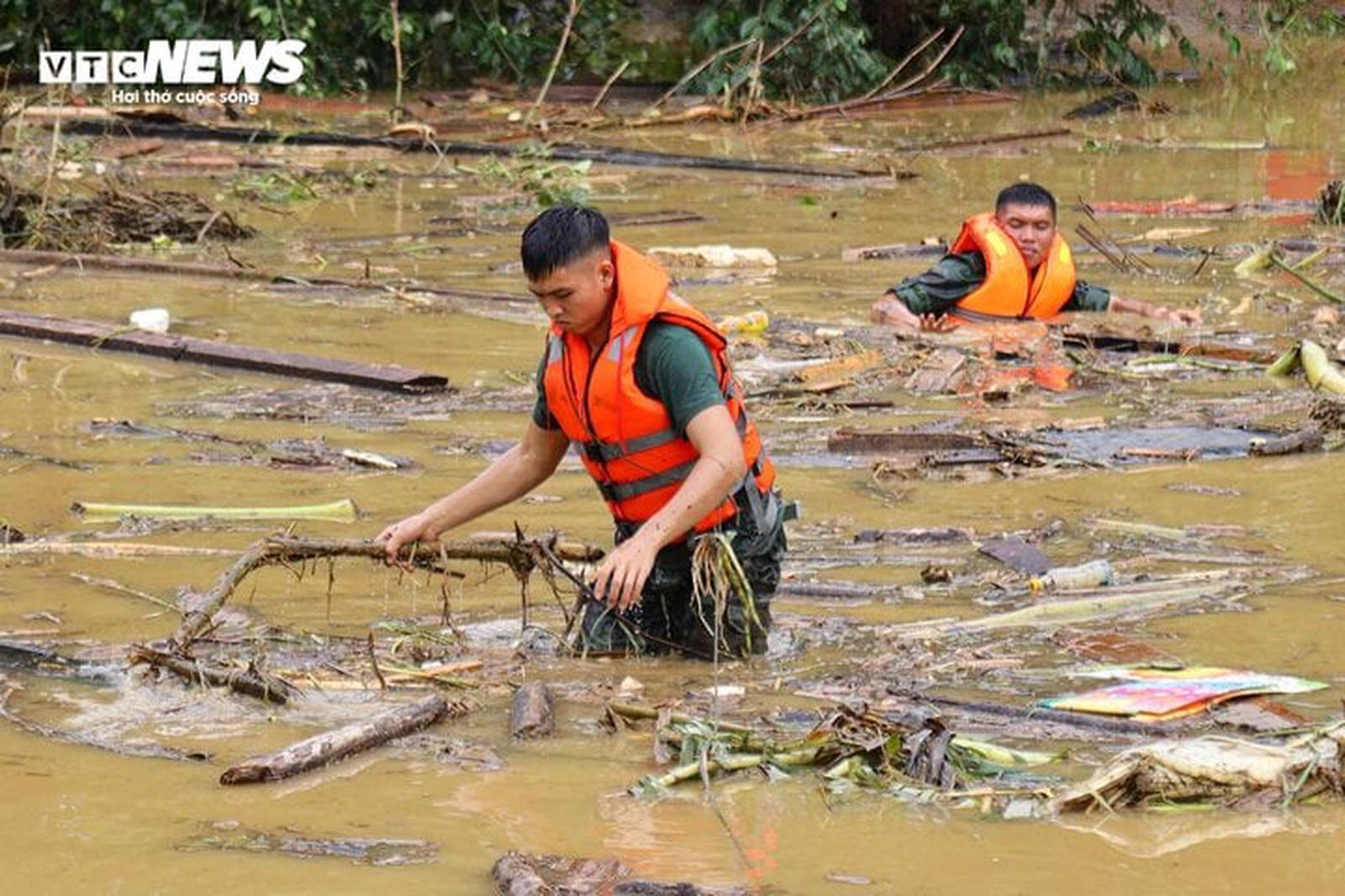 Các chiến sĩ dầm mình trong nước lũ để tìm kiếm những nạn nhân mất tích trong vụ lũ quét ở Làng Nủ, xã Phúc Khánh, huyện Bảo Yên, tỉnh Lào Cai. Ảnh: VTC NEWS