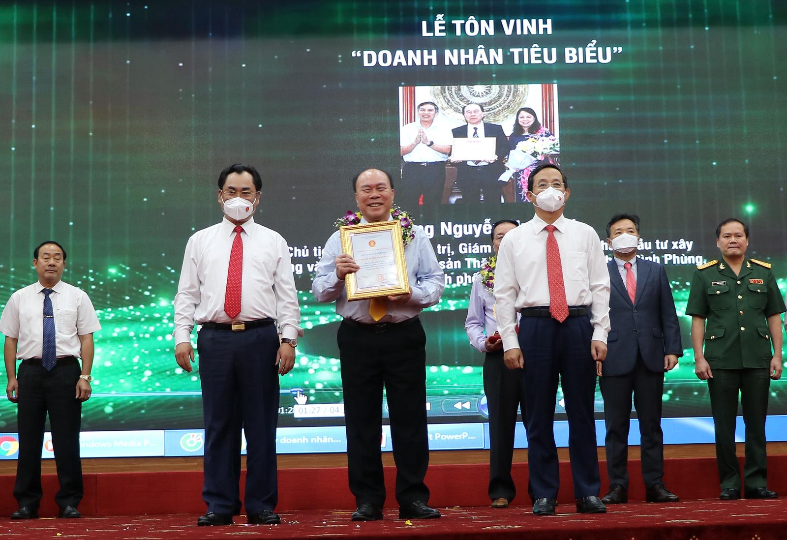 Ông Nguyễn Huy Quý, Tổng Giám đốc Công ty Cổ phần Đầu tư Xây dựng và Khai thác Khoáng sản Thăng Long(đứng giữa) đón nhận Danh hiệu "Doanh nhân tiêu biểu" . Ảnh: Phạm Duy