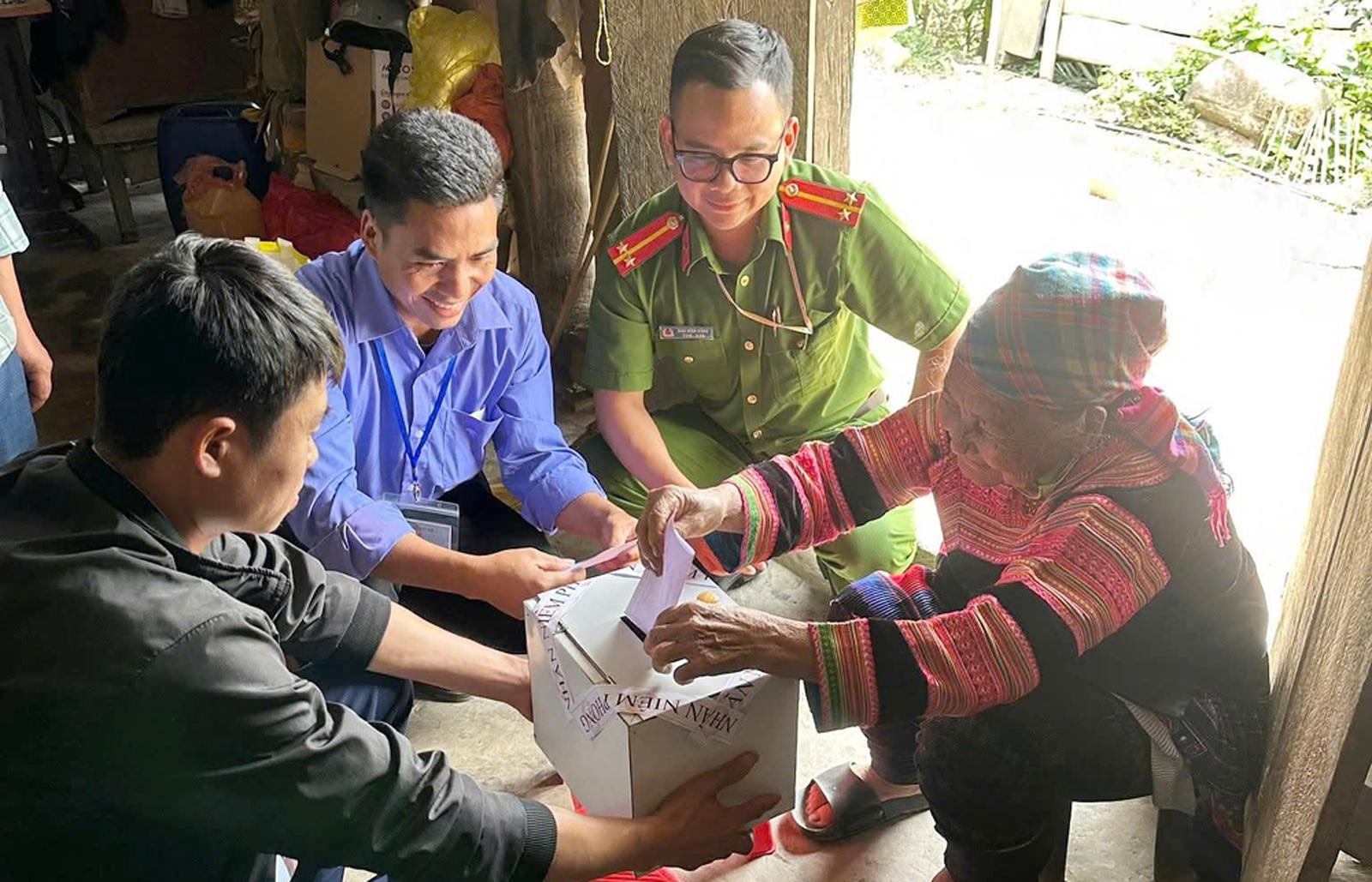 Hình ảnh Công an Thanh Hóa cùng chính quyền địa phương xuống tận cơ sở đưa hòm phiếu cho người yếu thế bỏ phiếu trong cuộc bầu cử. Ảnh: Công an Thanh Hóa