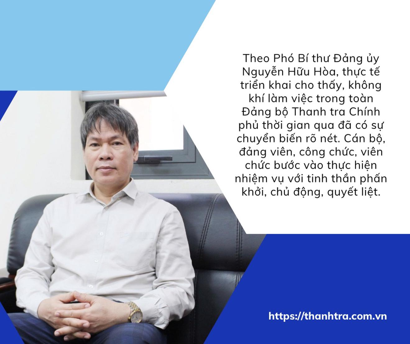 Cũng theo Phó Bí thư Đảng ủy Nguyễn Hữu Hòa, thực tế triển khai cho thấy, không khí làm việc trong toàn Đảng bộ Thanh tra Chính phủ thời gian qua đã có sự chuyển biến rõ nét. Cán bộ, đảng viên, công chức, viên chức bước vào thực hiện nhiệm vụ với tinh thần phấn khởi, chủ động, quyết liệt. Nhiều nhiệm vụ quan trọng được triển khai với cường độ cao, thời gian gấp, thậm chí làm việc ngoài giờ, xuyên ngày nghỉ để bảo đảm tiến độ và chất lượng. Tinh thần “không có người nghỉ khi công việc chưa hoàn thành” đã trở thành động lực thúc đẩy hiệu quả công việc, tạo nên một khí thế mới trong toàn ngành.