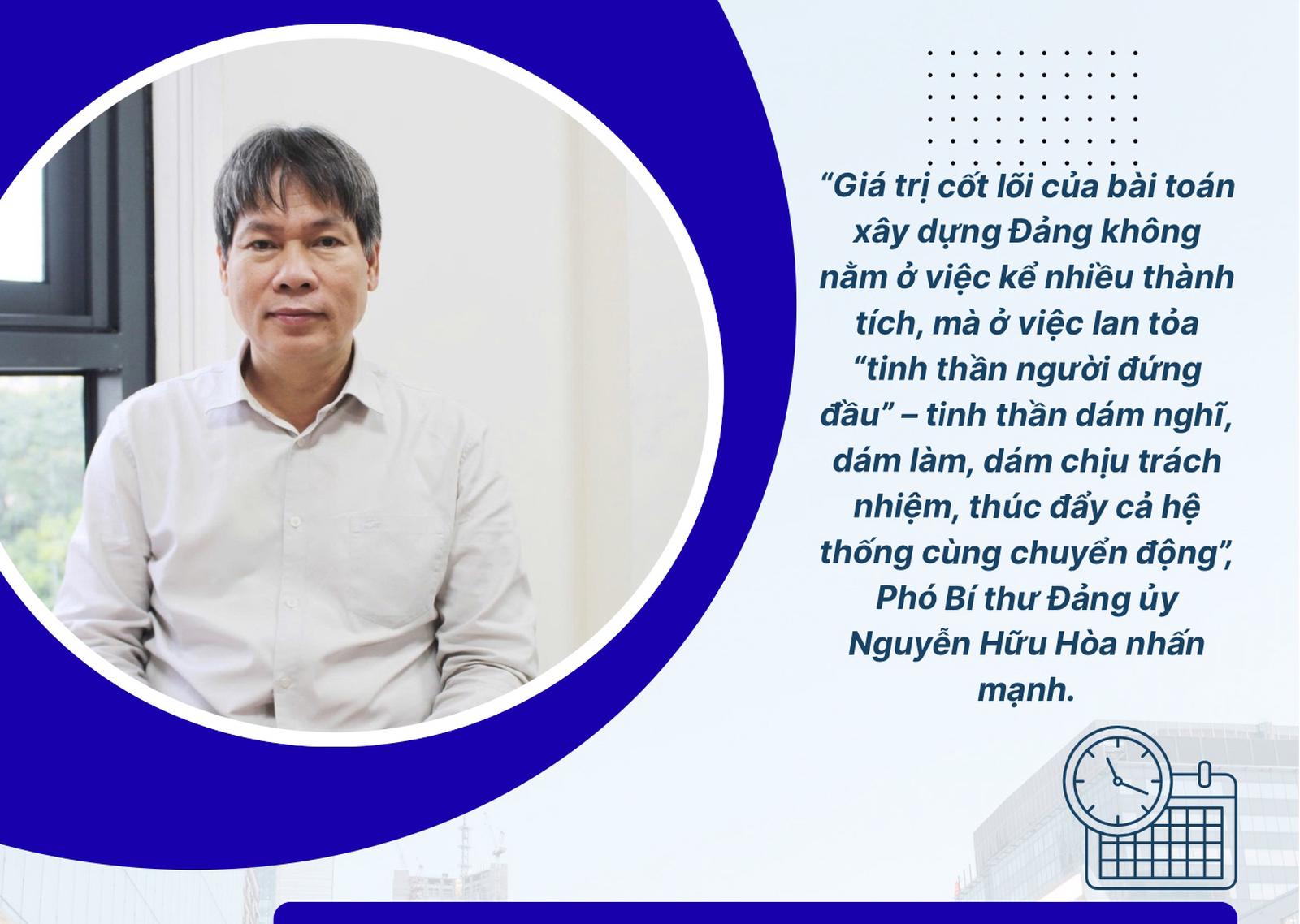Đây không chỉ là khẩu hiệu hành động mà còn là biểu hiện tập trung của việc chuyển hóa tư duy lãnh đạo thành hành động cụ thể. “Giá trị cốt lõi của bài toán xây dựng Đảng không nằm ở việc kể nhiều thành tích, mà phải là việc lan tỏa “tinh thần người đứng đầu” – tinh thần dám nghĩ, dám làm, dám chịu trách nhiệm, thúc đẩy cả hệ thống cùng chuyển động”, Phó Bí thư Đảng ủy Nguyễn Hữu Hòa nhấn mạnh.