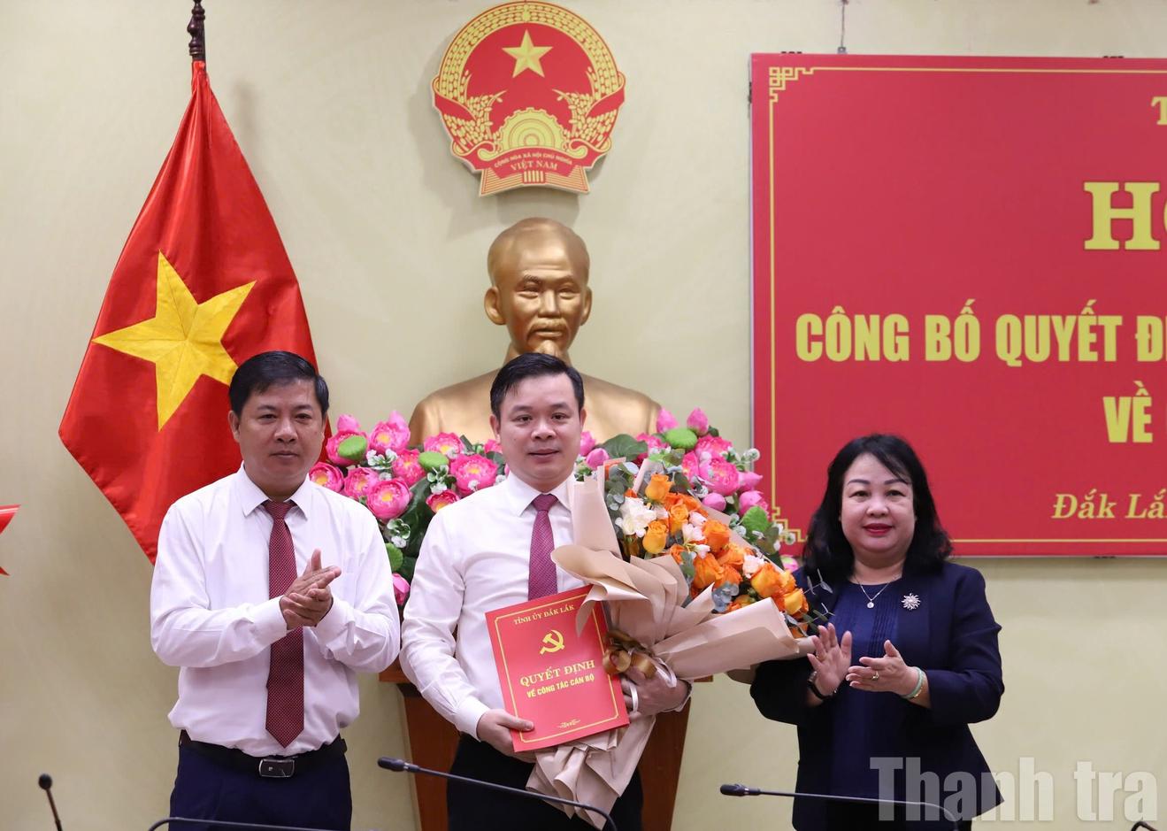 Bí thư Tỉnh ủy Đắk Lắk Lương Nguyễn Minh Triết và Phó Bí thư Thường trực, Chủ tịch HĐND tỉnh Cao Thị Hòa An trao quyết định cho ông Đỗ Hữu Huy. Ảnh: KB