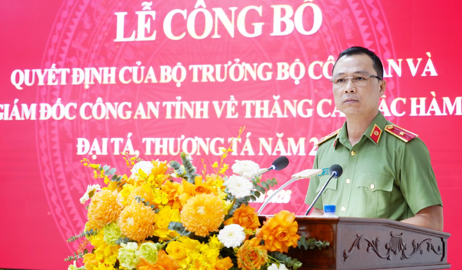 Ông đồng thời đề nghị cán bộ lãnh được thăng cấp bậc hàm không ngừng tu dưỡng, rèn luyện, nâng cao trình độ, năng lực công tác, đoàn kết, thống nhất, quyết tâm hoàn thành xuất sắc mọi nhiệm vụ được giao, góp phần bảo đảm vững chắc an ninh, trật tự, xứng đáng với sự tin tưởng của Đảng, Nhà nước và Nhân dân.